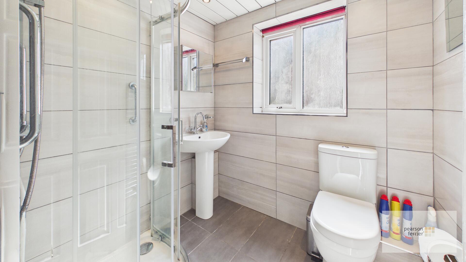 The shower room is modern and fully tiled with large neutral-coloured tiles on the walls and floor. It features a corner shower cubicle with glass doors, a pedestal basin, and a close-coupled toilet, heated towel rail, window to the side.