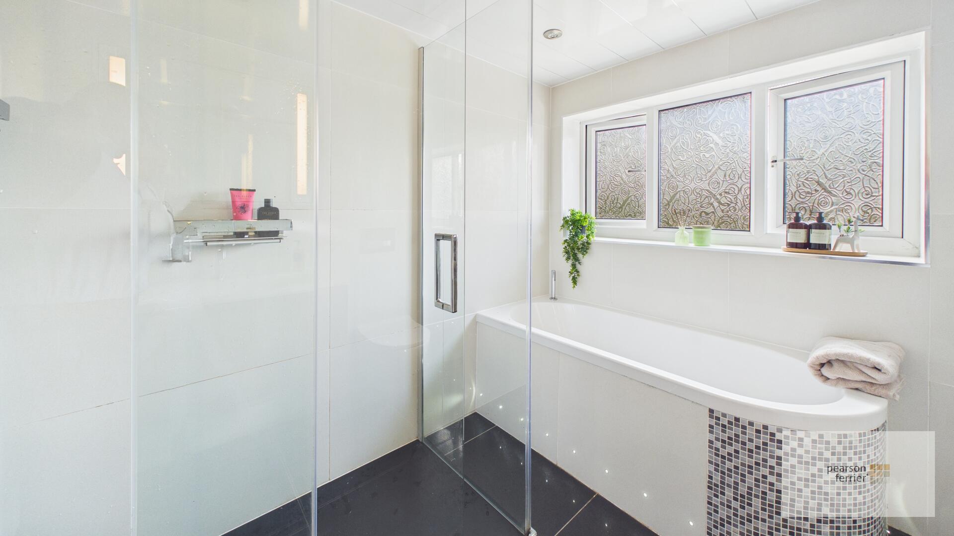 Contemporary four piece white suite comprising of; Low level w.c, hand wash basin set in vanity unit, bath and walk in shower cubicle with rain fall shower, tiled elevations, down lighting and extractor fan.