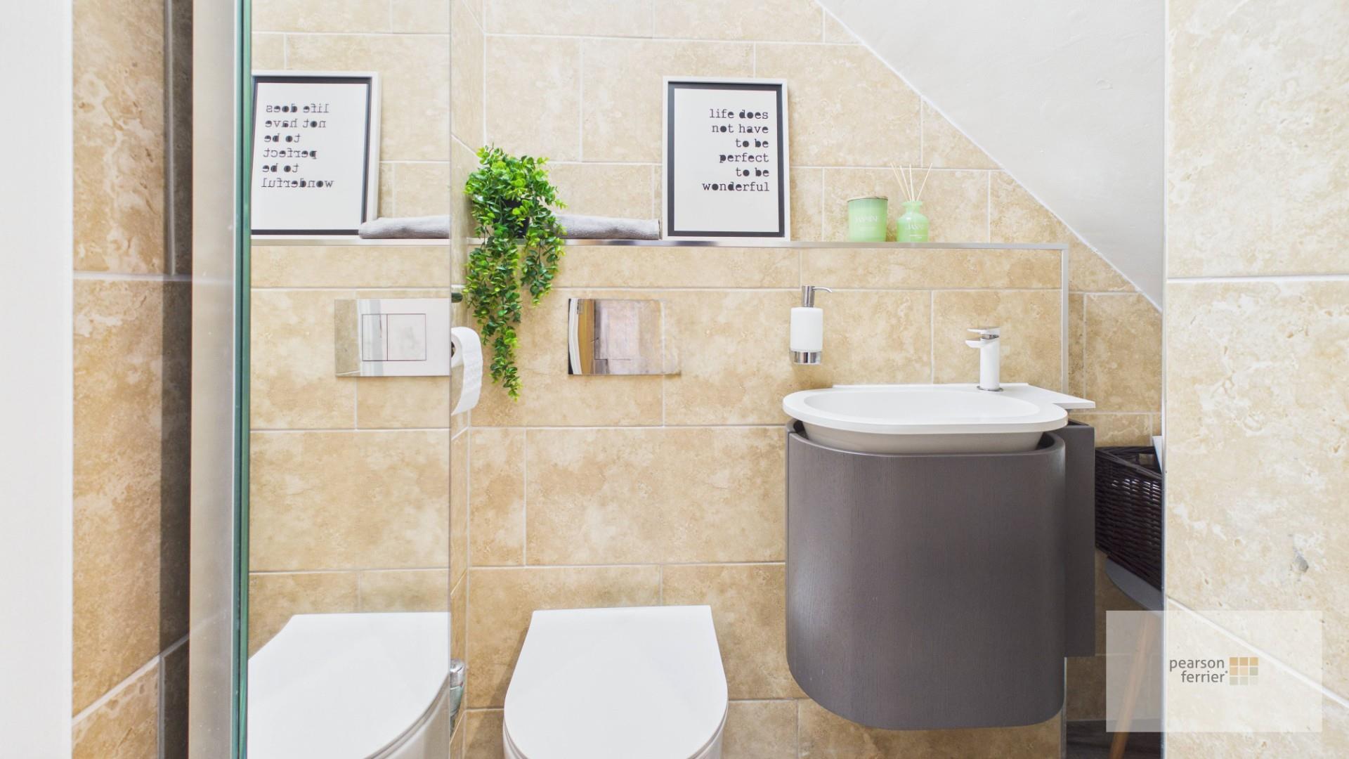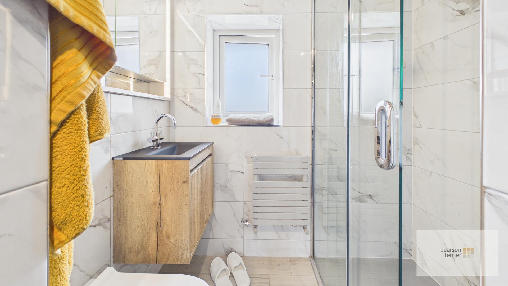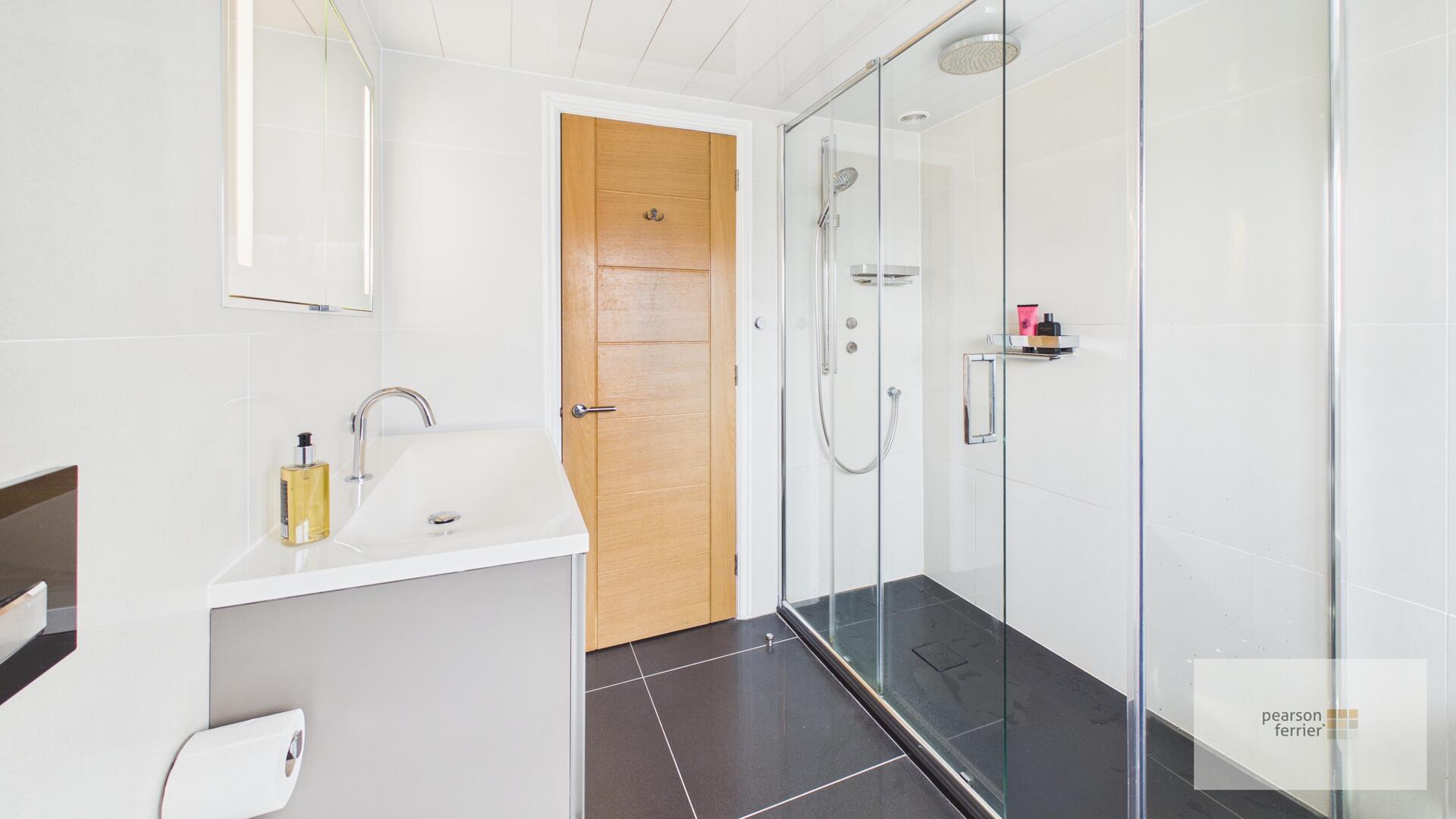 Double glazed frosted window to the rear, low level w.c, hand wash basin set in vanity unit, walk in shower cubicle with rainfall shower, down lighting and extractor fan.