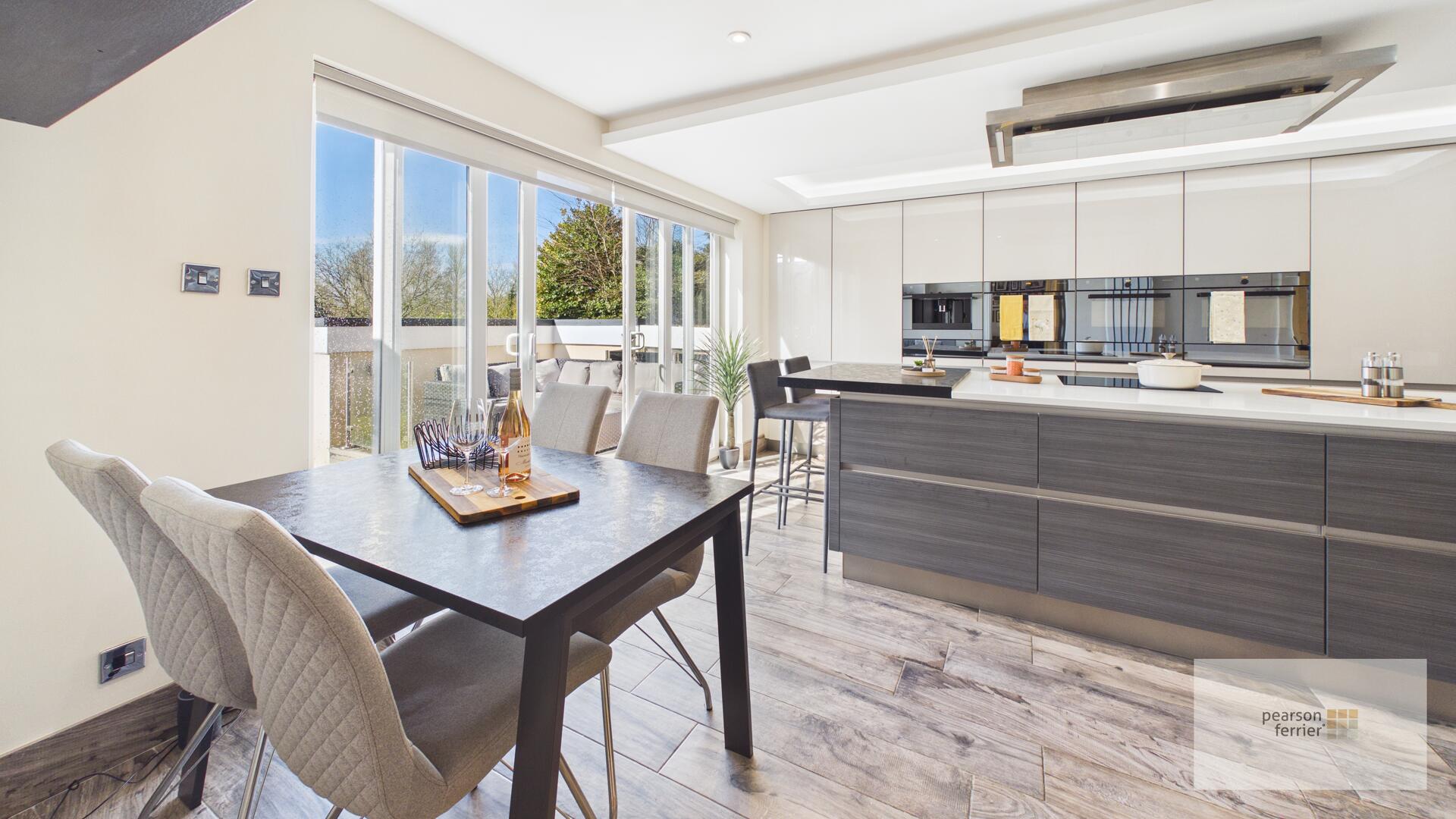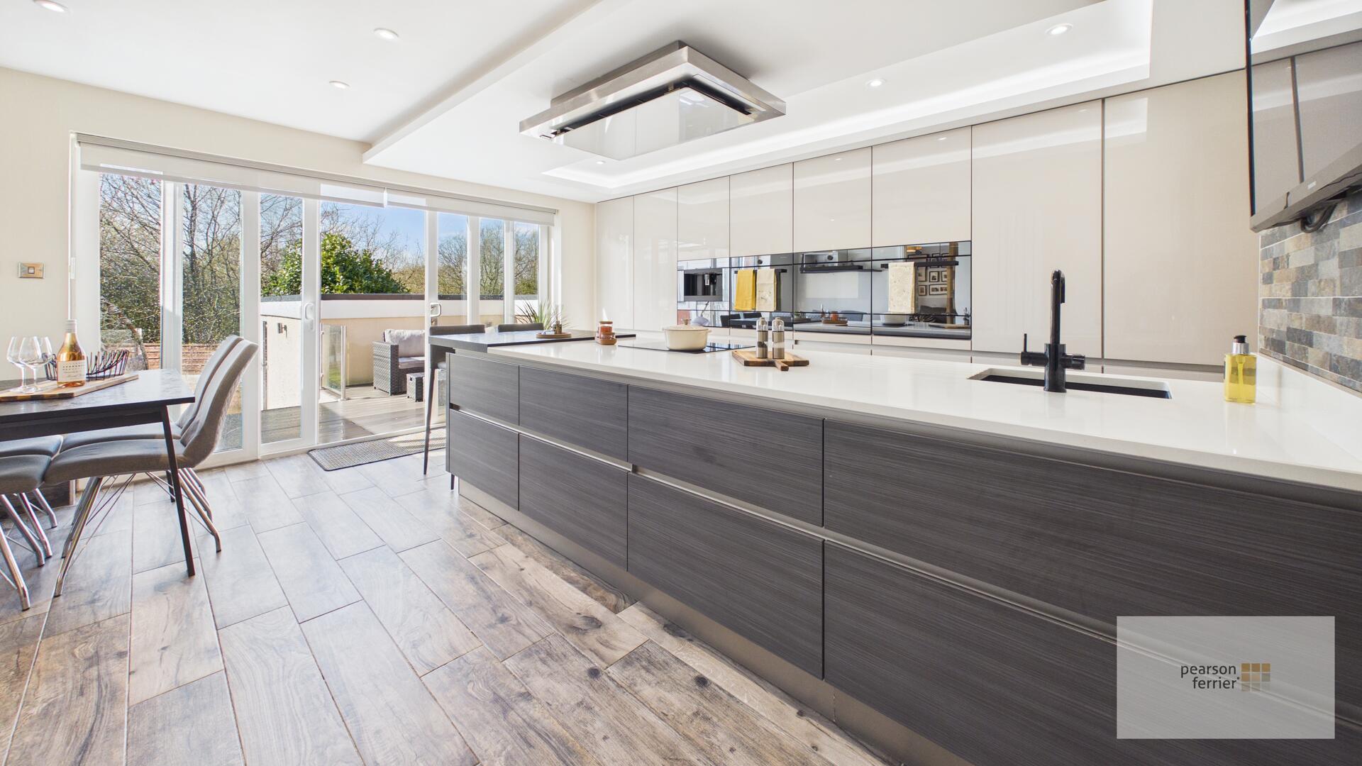 Double glazed windows and doors to the rear, contemporary kitchen with under floor heating comprising of; selection of wall & base units with granite work surfaces to complement, breakfast bar, Integrated Siemens fridge/freezer, dishwasher, two V Zug Combi steam ovens, microwave and coffee machine, 4 x plate warmers, sink with Zip instant boiling tap, down lighting and radiator.