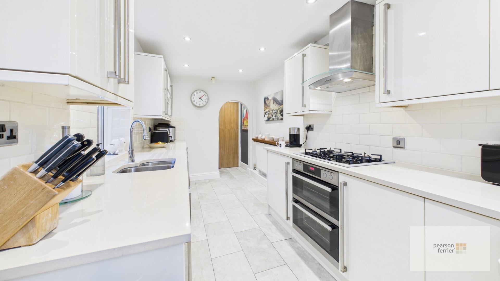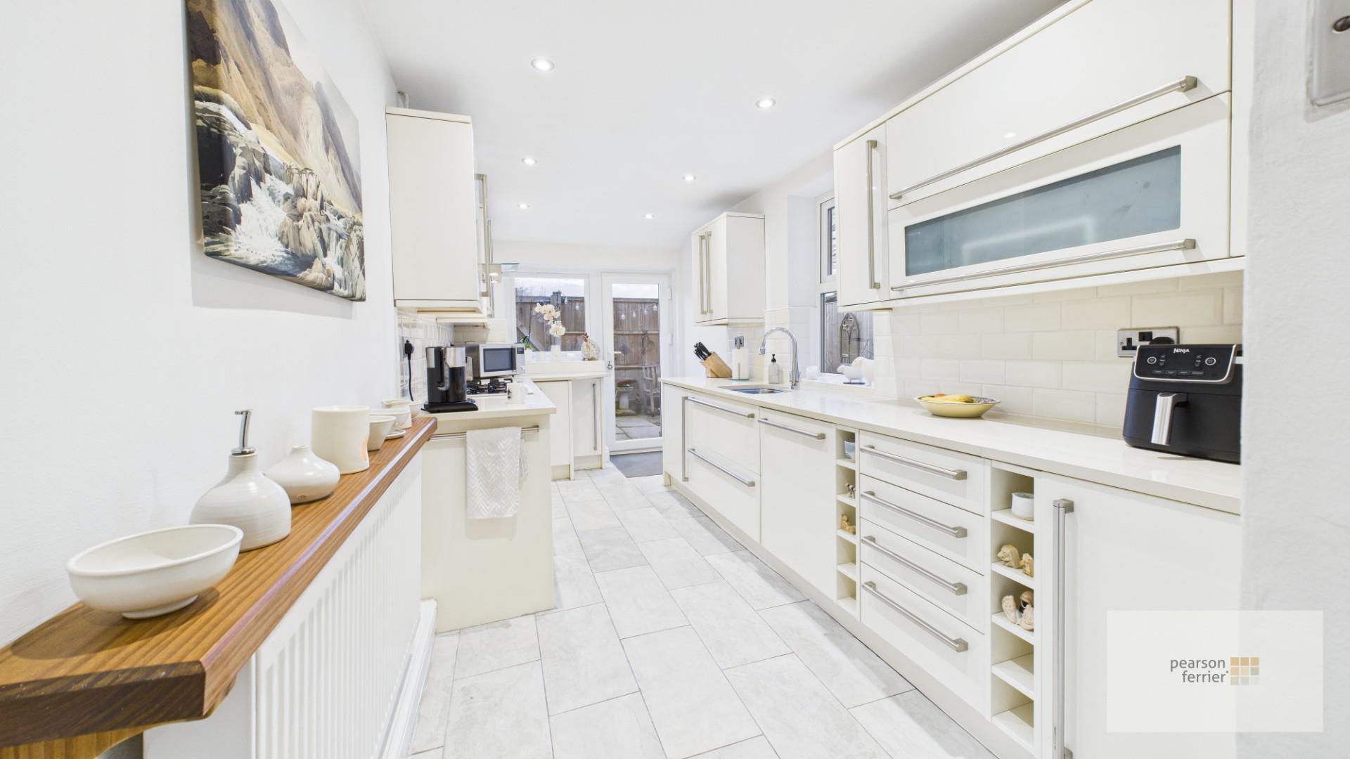 Impressive range of wall & base units in gloss cream with complementary polished stone worktops incorporating a 1 1/2 bowl sink unit. Built in appliances to include 5 burner gas hob and electric double oven. integrated washer, dishwasher, dryer and fridge. Tiled flooring and LED lighting. Windows to the side and rear and access onto the rear patio yard.