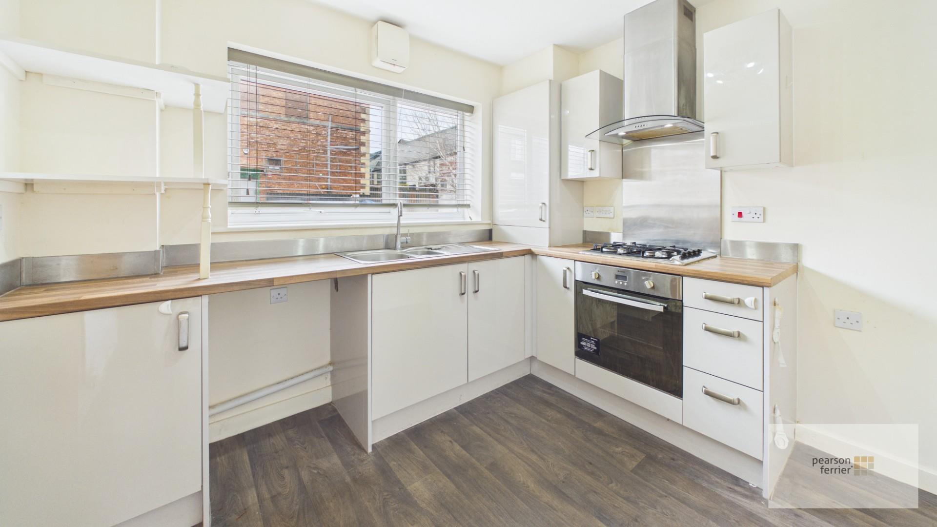 Comprehensive range of wall & base units in gloss cream with contrasting 'butchers block' style worktops incorporating a single drainer sink unit. Built in appliances to include: gas hob, electric oven and extraction system. Concealed combination gas central heating boiler. Space for washer and fridge freezer. Window to the front.