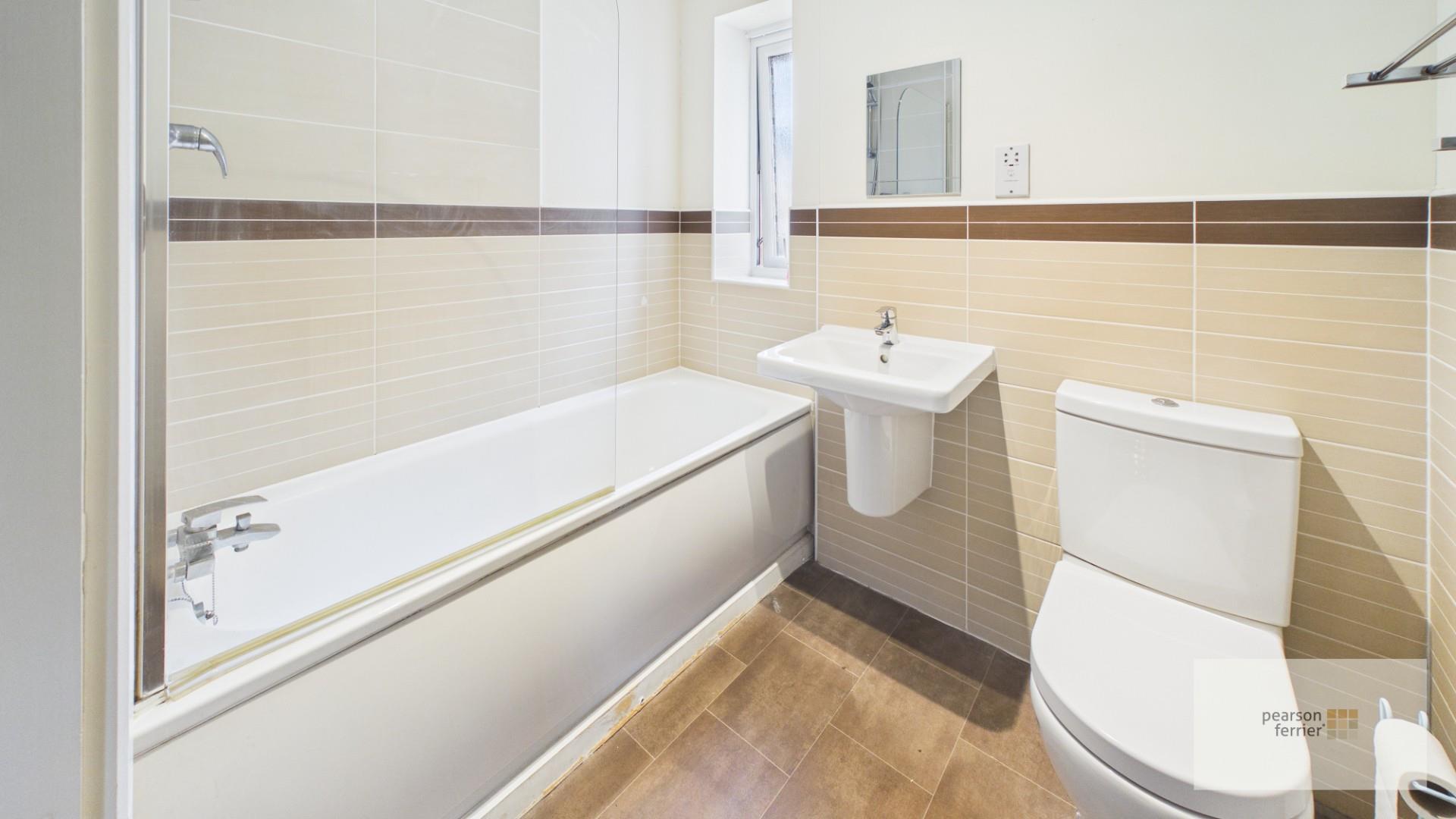 Three piece suite comprising: a low flush w.c., wash hand basin and panelled bath. Part tiled walls and window to the front.