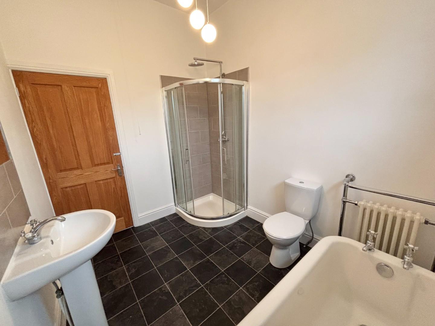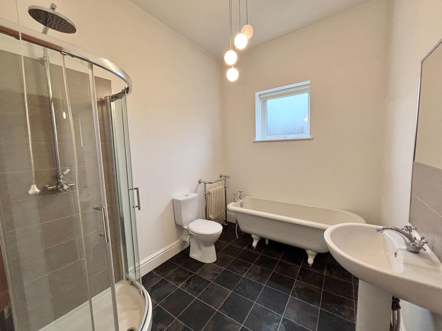 Rear facing PVC double glazed window with frosted glass design, a stunning four piece traditional White suite comprising of low level WC, pedestal wash hand basin, free standing bath on feature feet, corner shower cubicle housing shower fitment, splash back tiling to compliment, Victorian style radiator, ceramic tiled flooring.