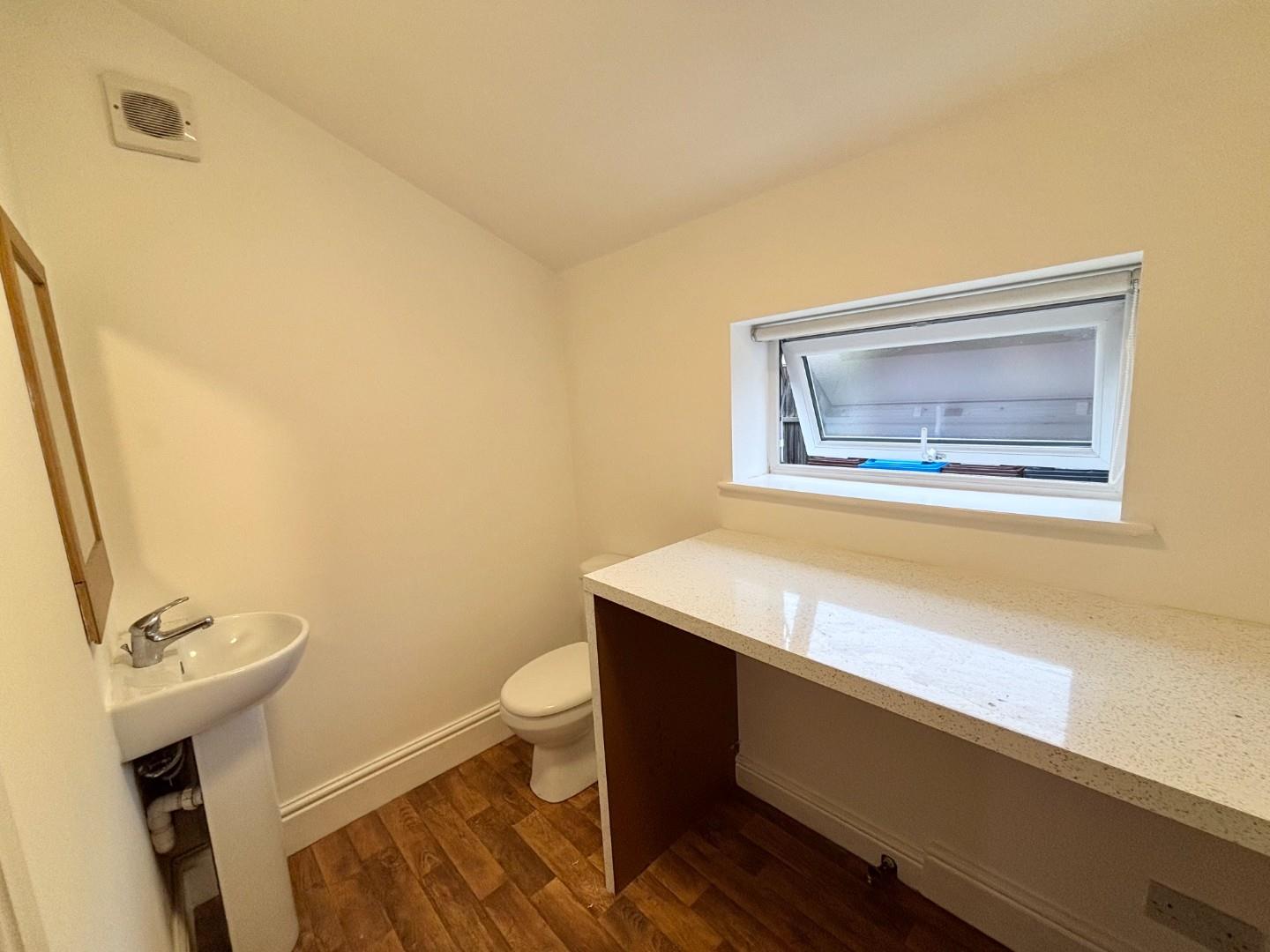 Rear facing PVC double glazed window with frosted glass design, a two piece modern White suite comprising of low level WC, pedestal wash hand basin, radiator, power point, plumbed for automatic washing machine.