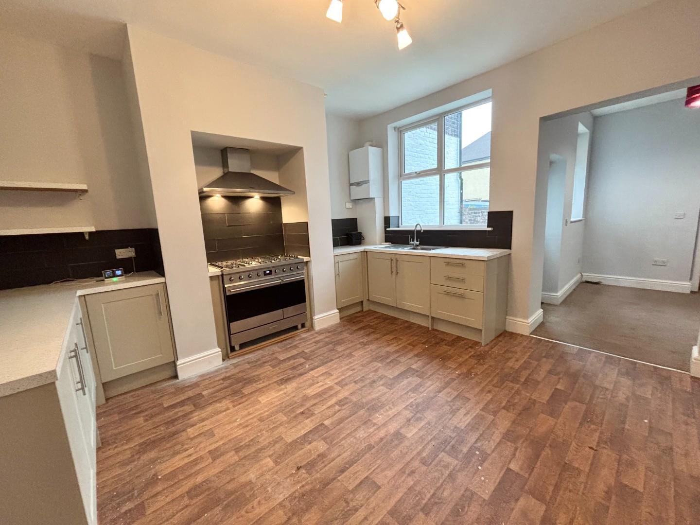 Rear facing PVC double glazed window, a range of modern fitted wall and base units in cappuccino finish with complimentary high gloss worktops incorporating a stainless steel single drainer sink unit, brick wall effect splash back, five ring stainless steel range cooker with extractor canopy over, wall mounted Valliant combination gas central heating boiler, radiator, feature lighting, archway leading through to: