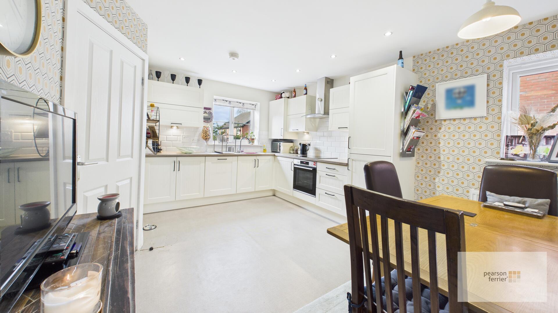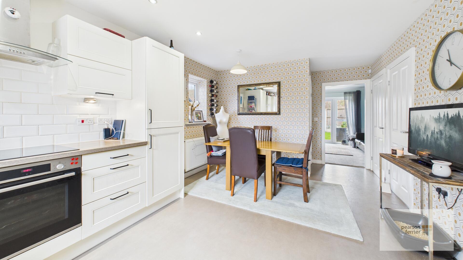 With a comprehensive range of wall & Base units in cream with contrasting worktops incorporating a single drainer sink unit with mixer tap. Built in appliances to include electric hob, oven and extraction system. Integrated fridge & freezer and concealed combination gas central heating boiler. Window to the front and the dining area has window to the side.