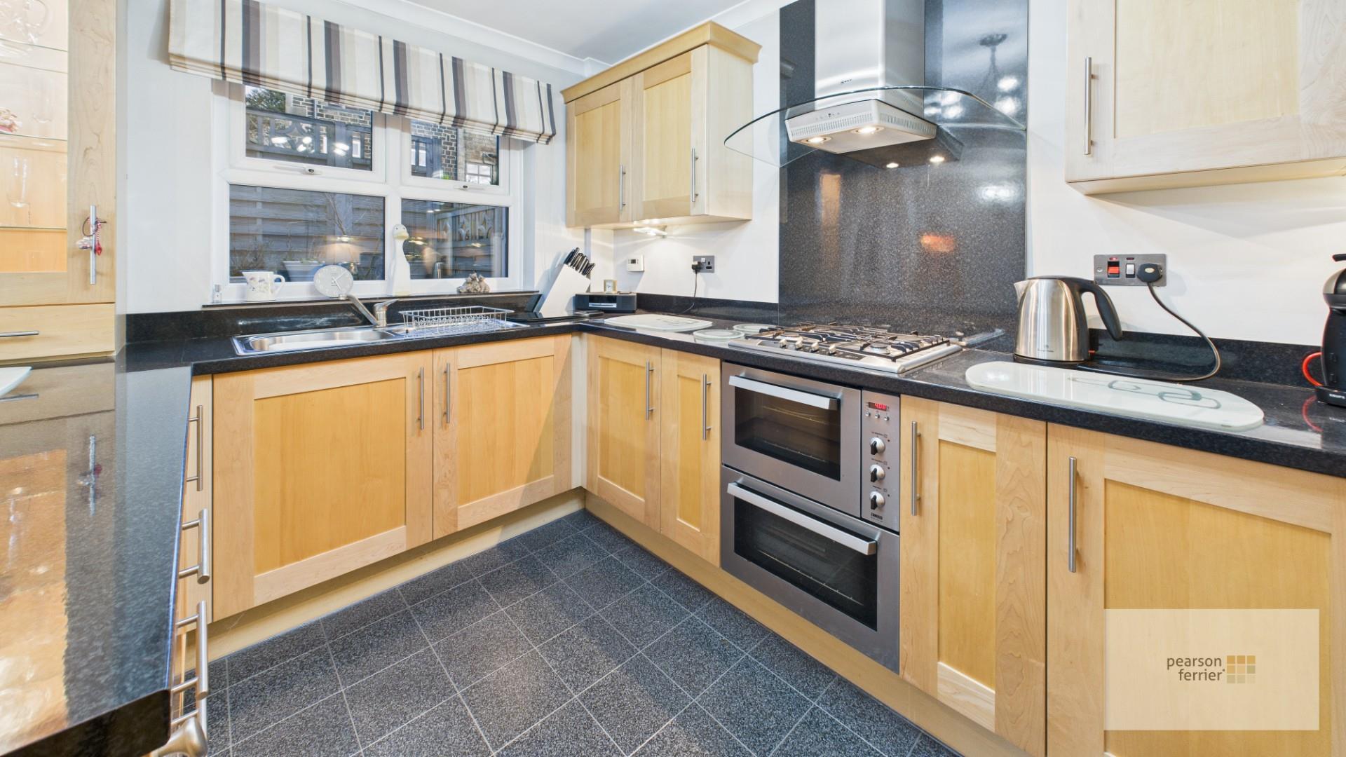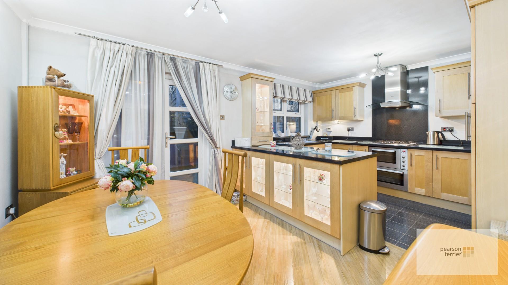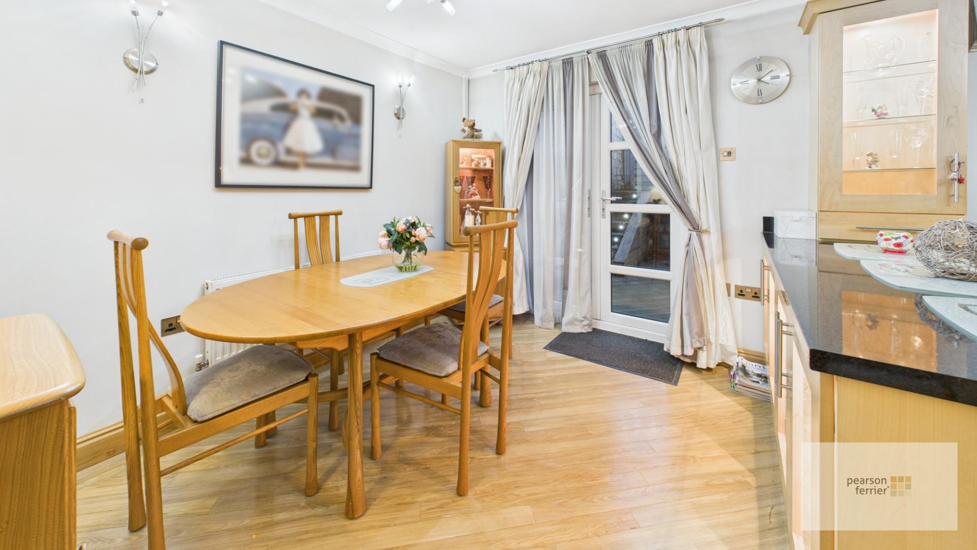 Comprehensive range of wall & base units in light oak finish with contrasting worktops incorporating a single drainer sink unit. Breakfast bar with illuminated display cabinets under. Built in appliances to include gas hob, electric double oven with extraction system over, integrated fridge and freezer. The dining area has patio doors leading onto the rear decked patio area.