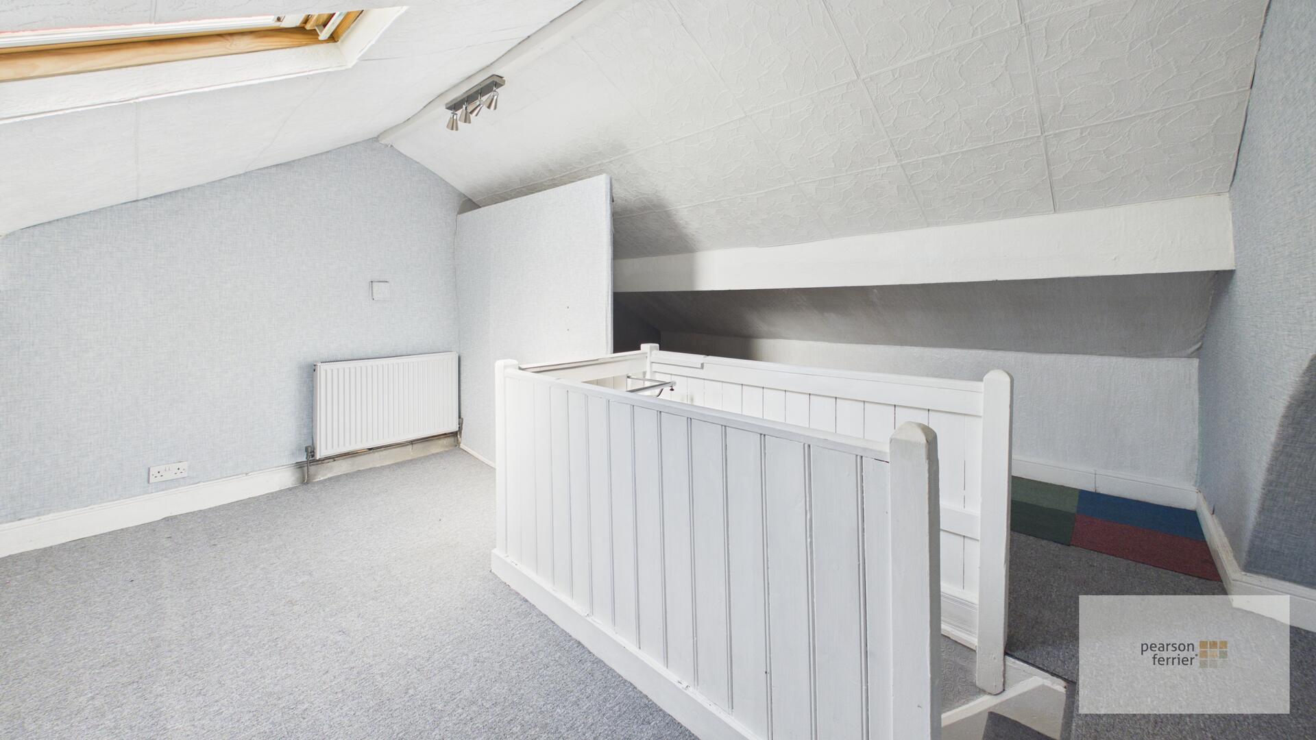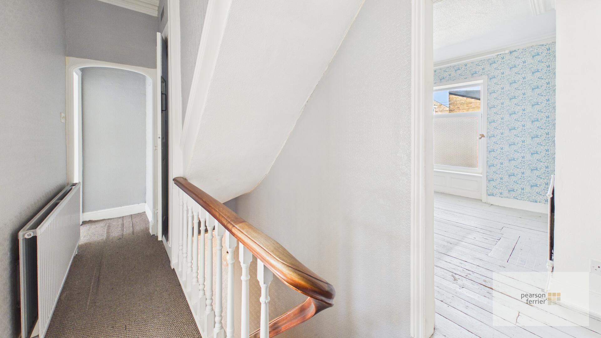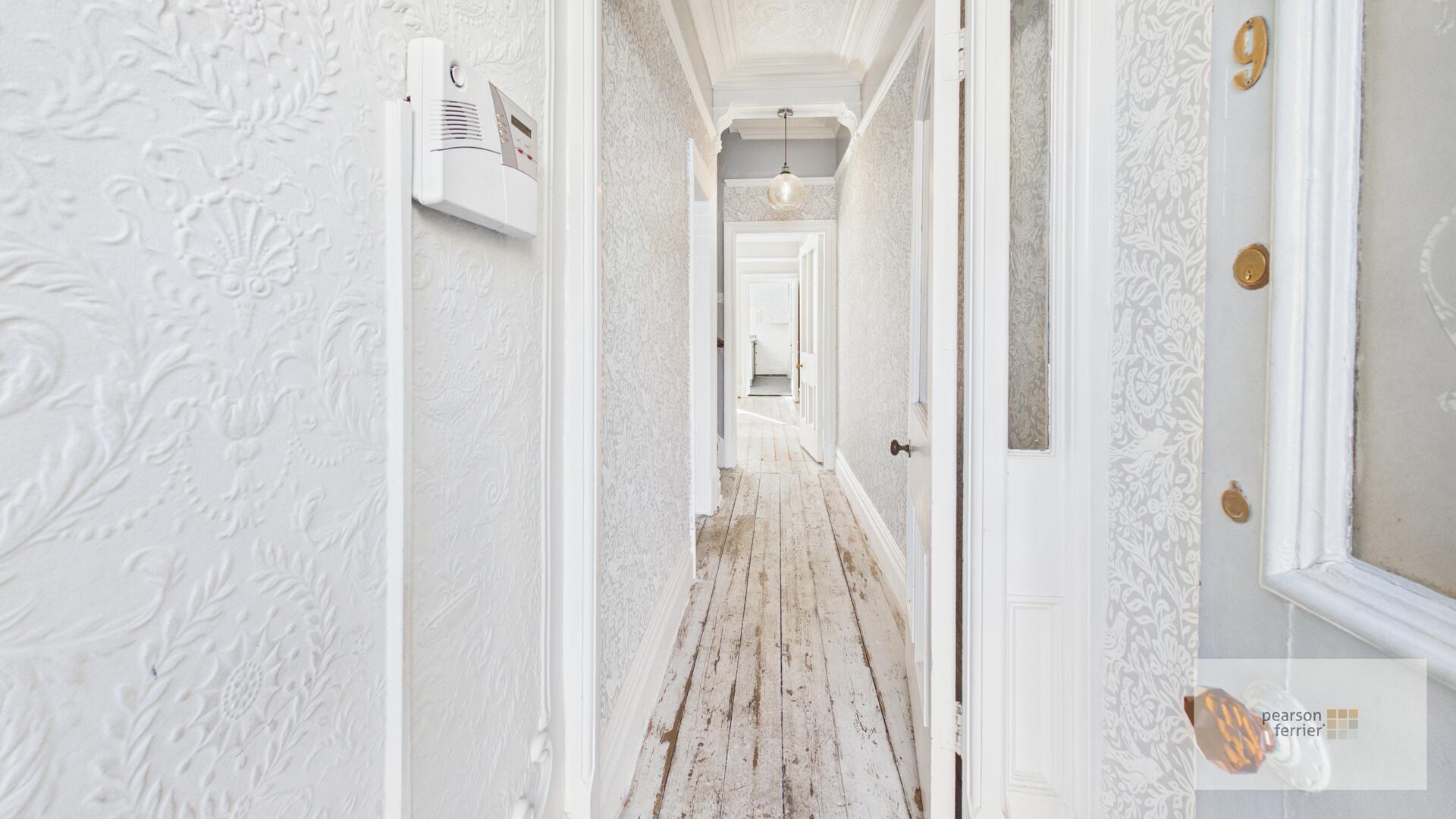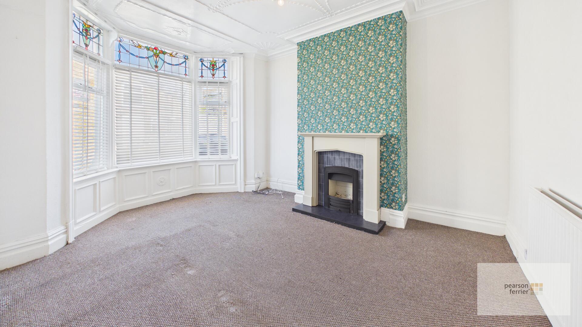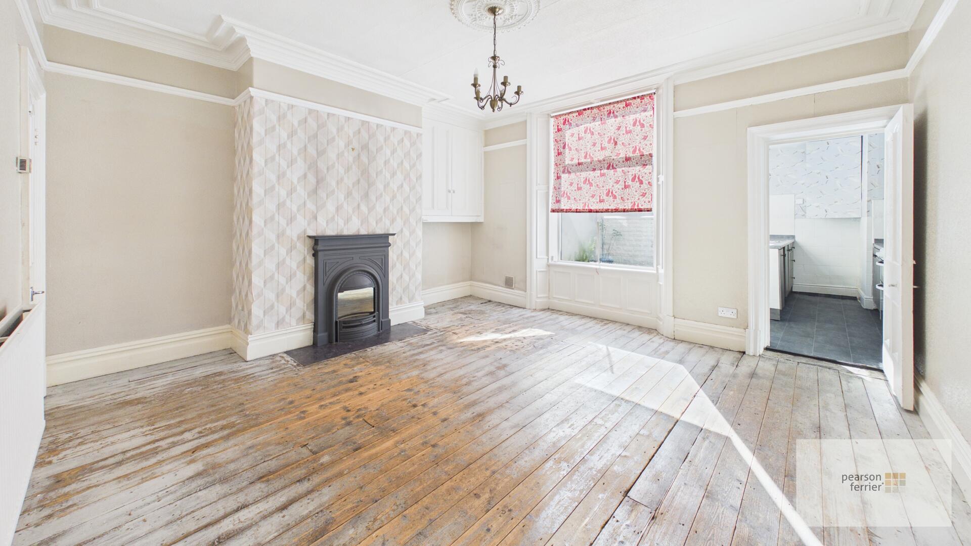 Stripped wooden floorboards and a decorative fireplace, window to the rear.
