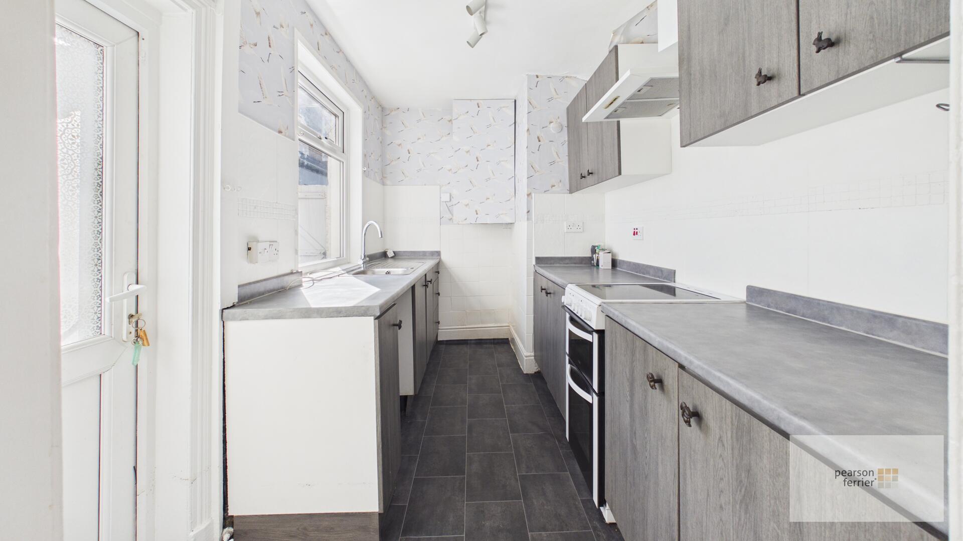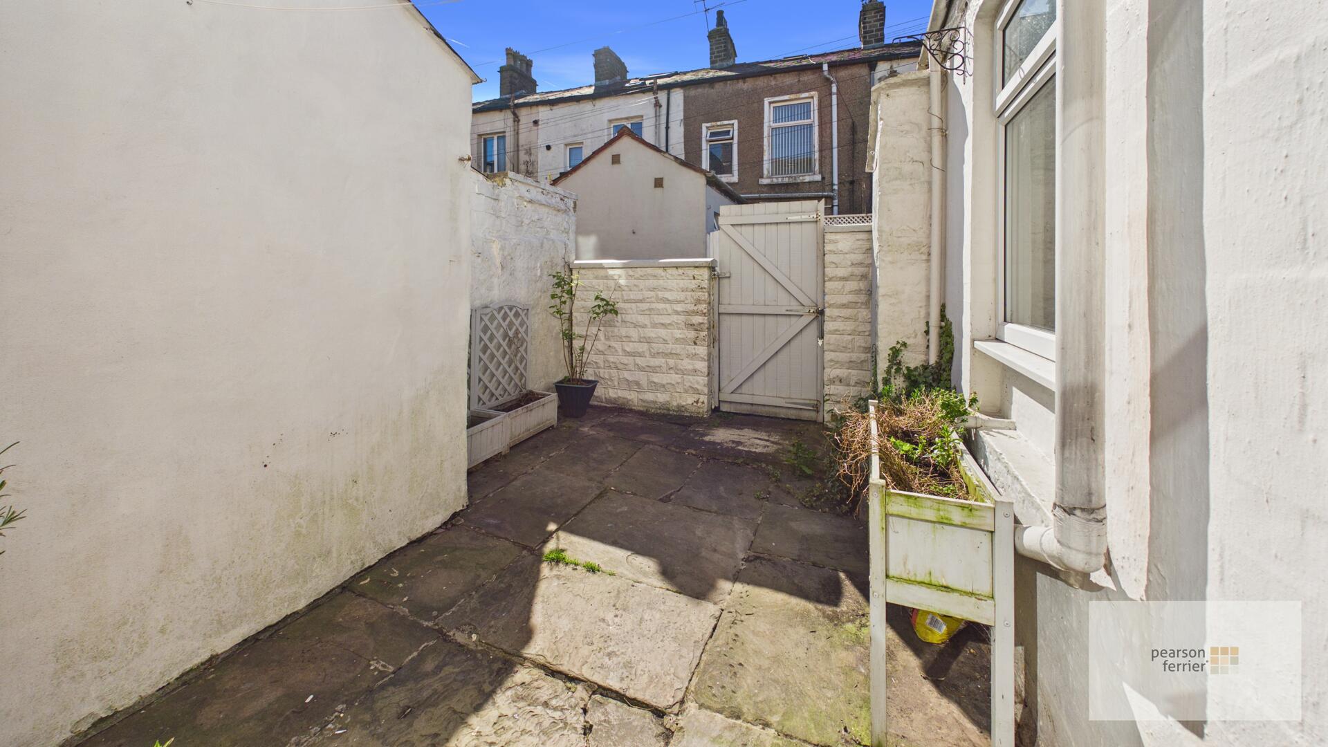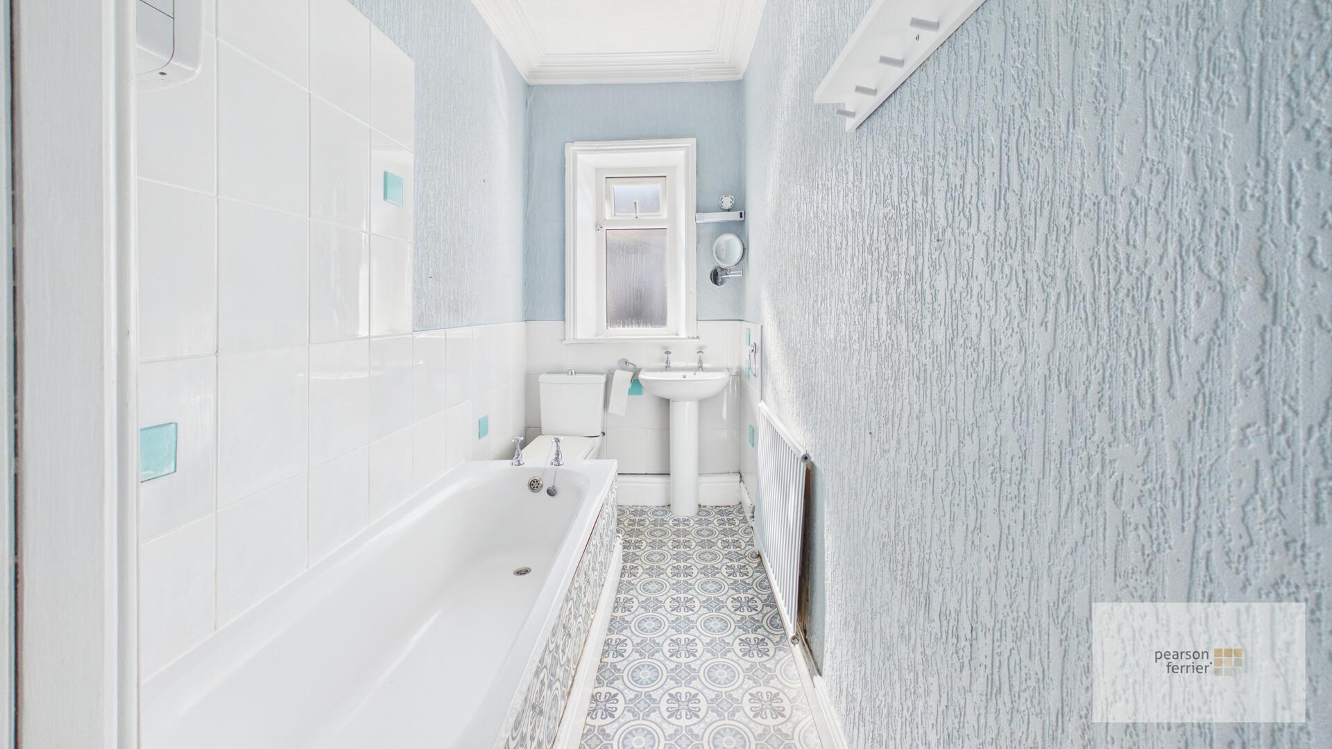 The bathroom features a white tiled bath with a shower attachment, a pedestal sink, and a toilet, tiled elevations, window to the rear.