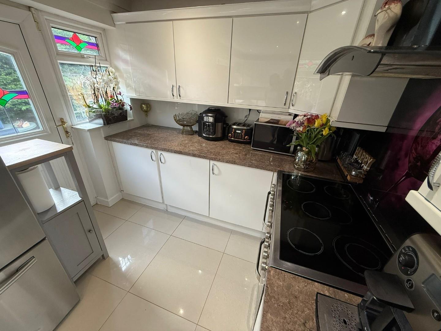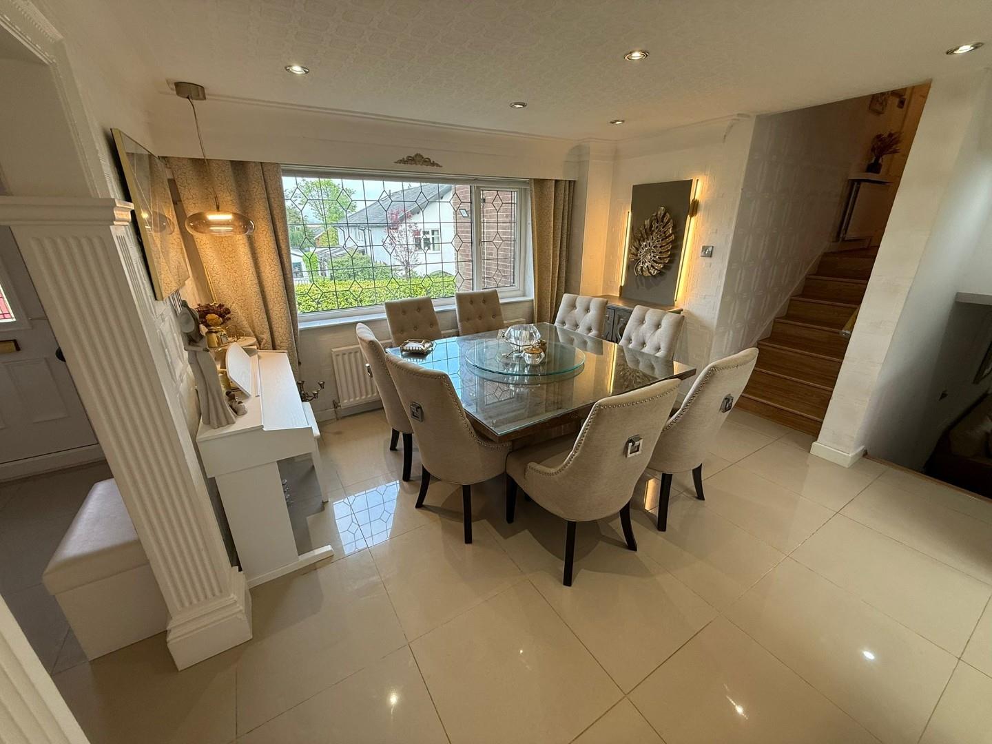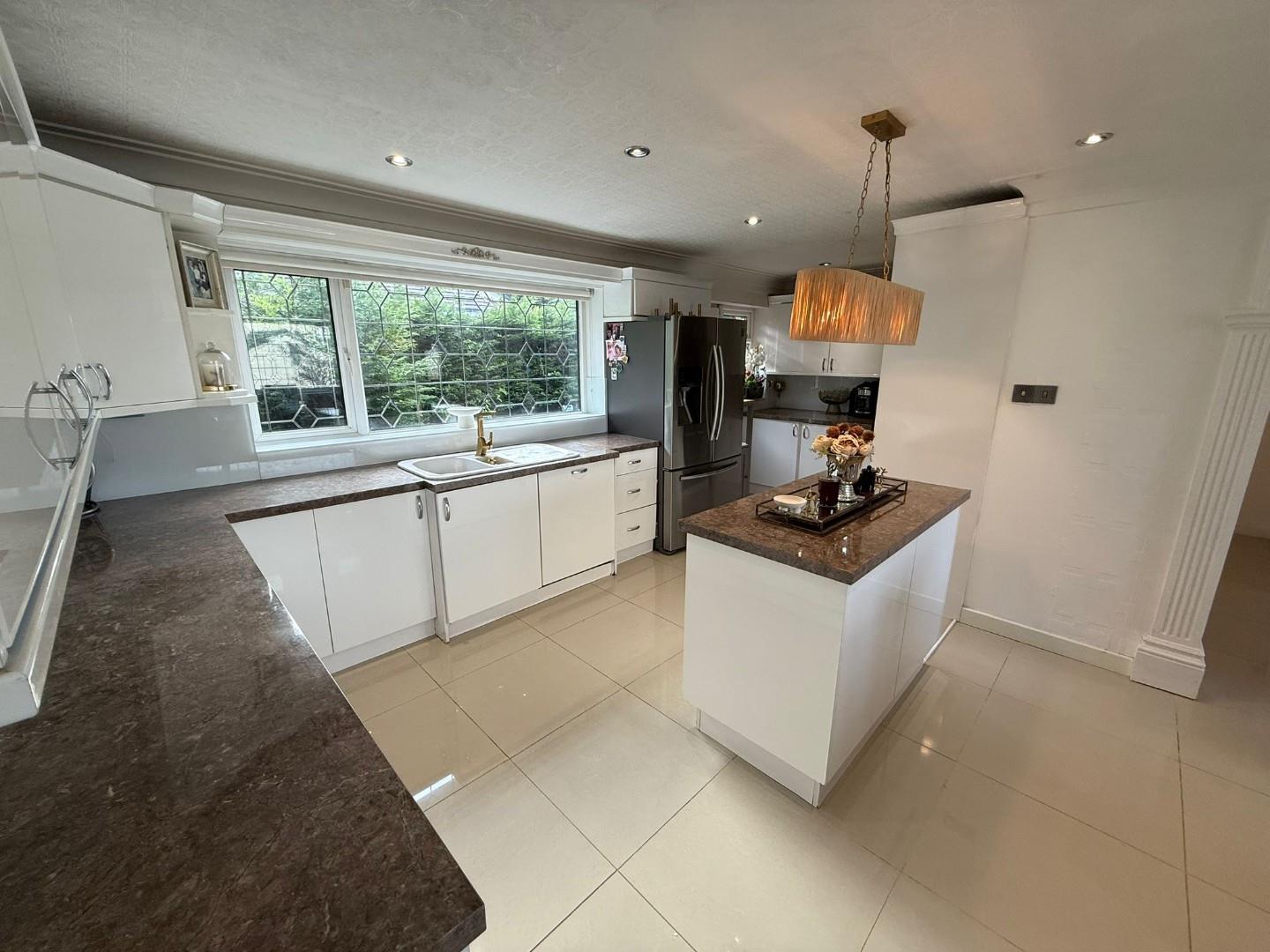 Pleasantly appointed kitchen with a range of wall & base units in gloss white with contrasting worktops. Central island, Electric range style cooker with extraction system over, space for American fridge freezer, integrated dishwasher. Dining are with bay window to the front, kitchen has windows to the side ands access onto the side patio. Polished tiled flooring.