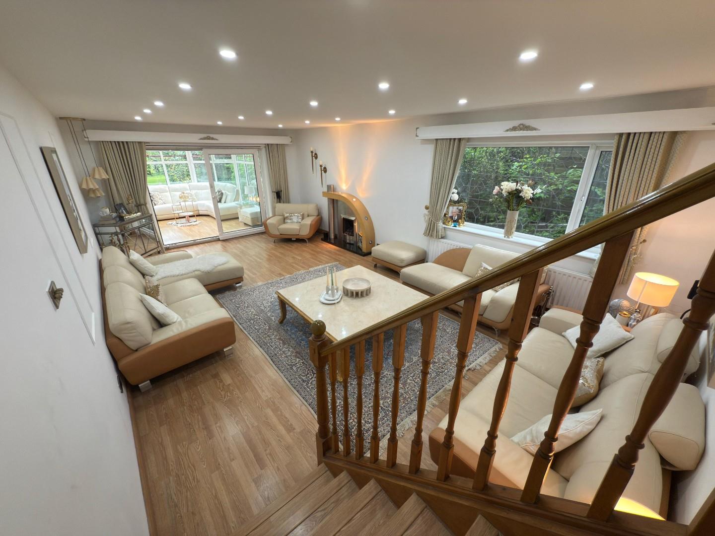 Accessed via a short staircase down from the kitchen. Impressive room with living flame coal effect fire in contemporary fireplace. Windows to the side and access onto the conservatory.
