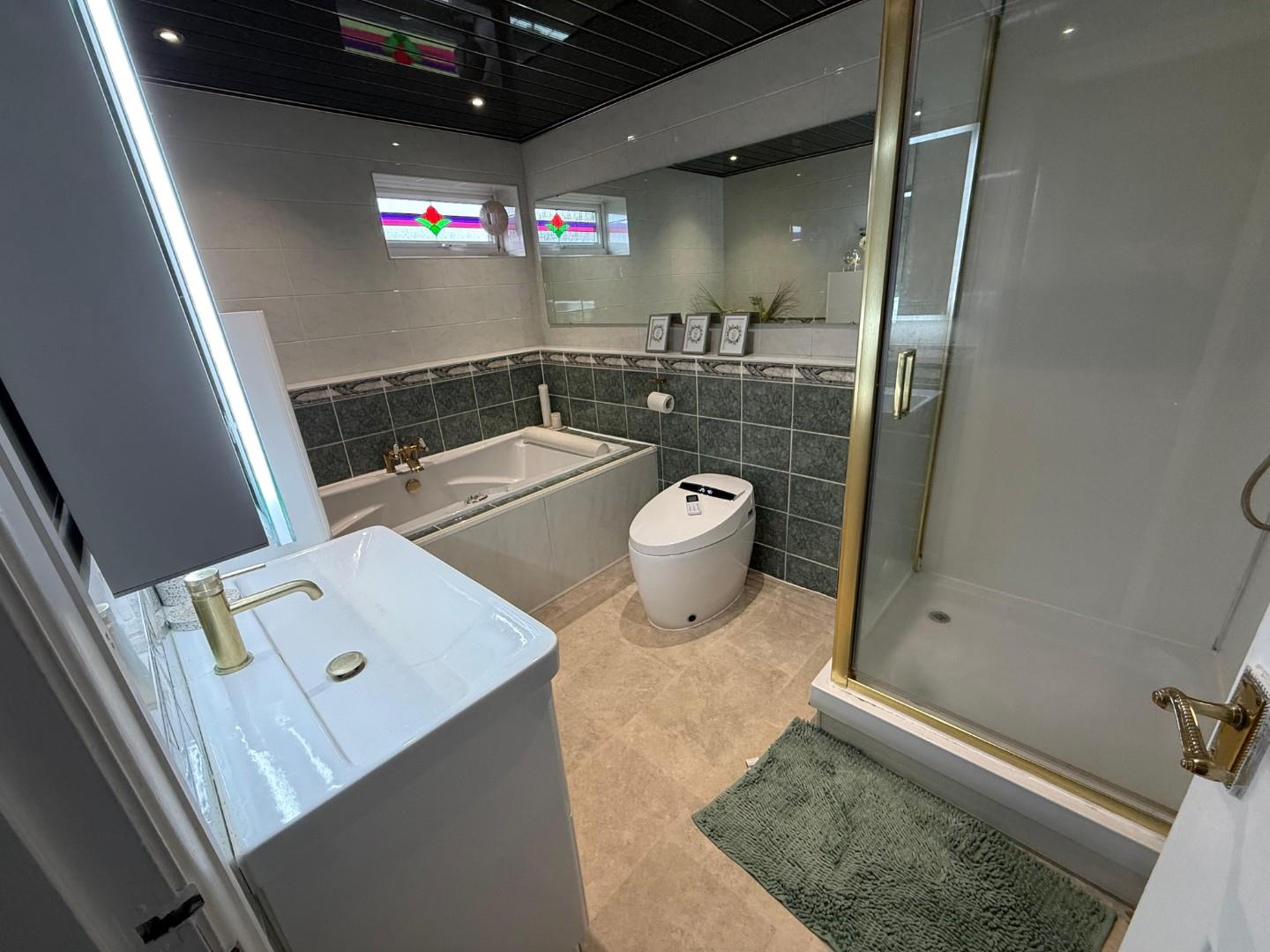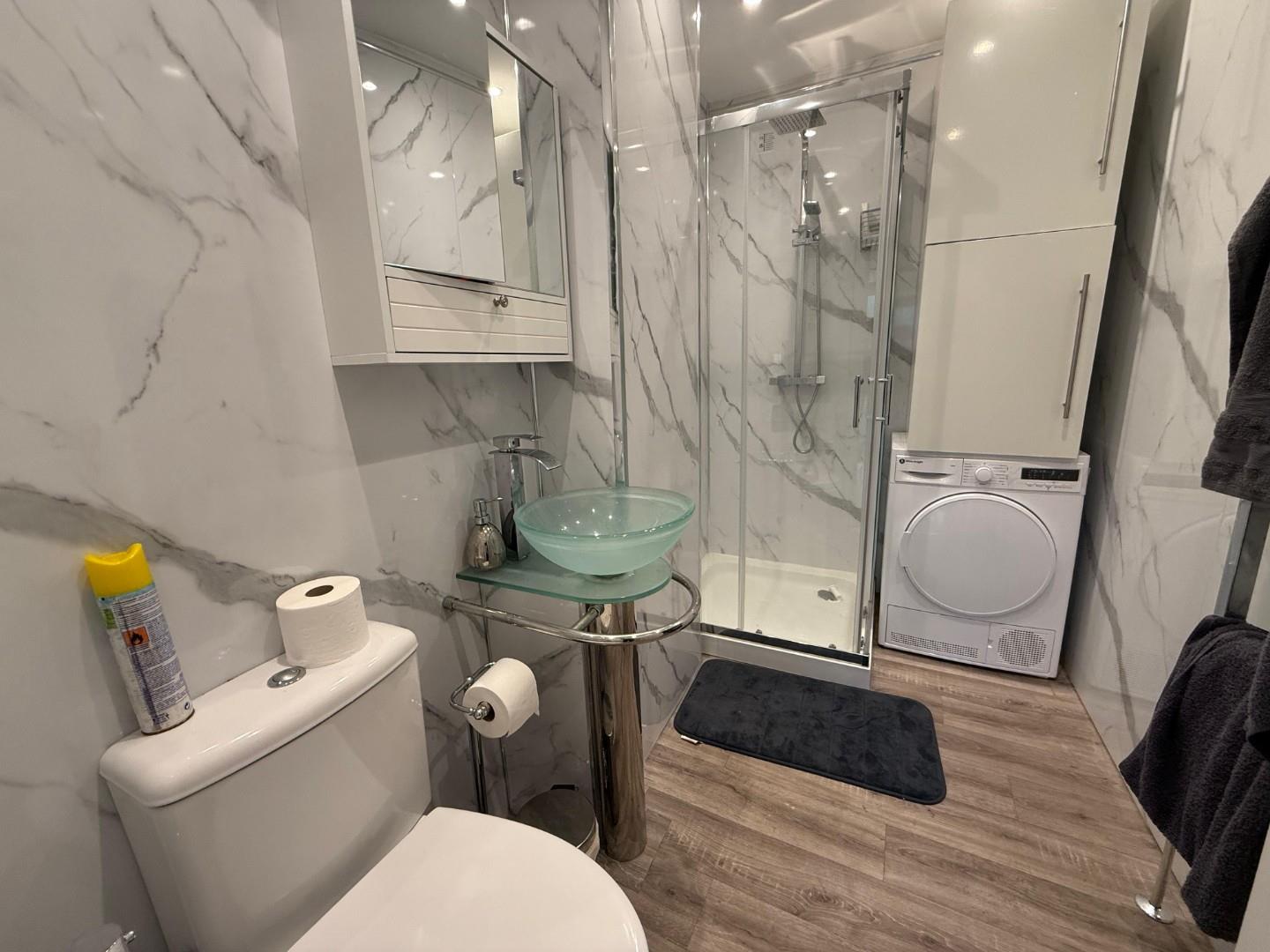 Good sized ensuite shower room comprising: a electrically operated w.c., vanity unit wash hand basin and shower cubicle with thermostatic shower. Tiled walls.