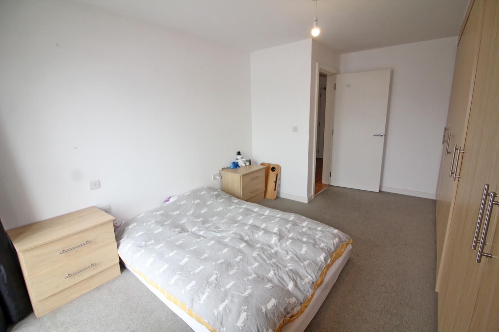 Range of fitted wardrobes in oak finish. Floor to ceiling window to the front. Double bed and bedside cupboard with drawers.