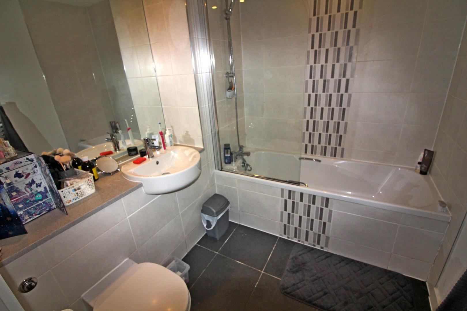 Three piece suite comprising: a low level WC , with concealed cistern, vanity unit wash hand basin and panelled bath with shower fitting over. Glass shower screen, part tiled walls and tiled flooring. Towel rail.