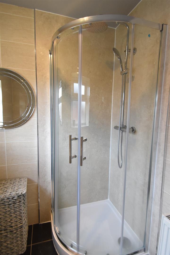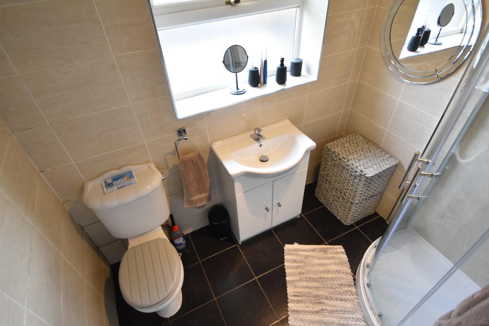 Nicely presented shower room comprising: a low flush w.c., vanity unit wash hand basin and shower cubicle with thermostatic shower. Tiled walls and tiled flooring. Window to the rear.