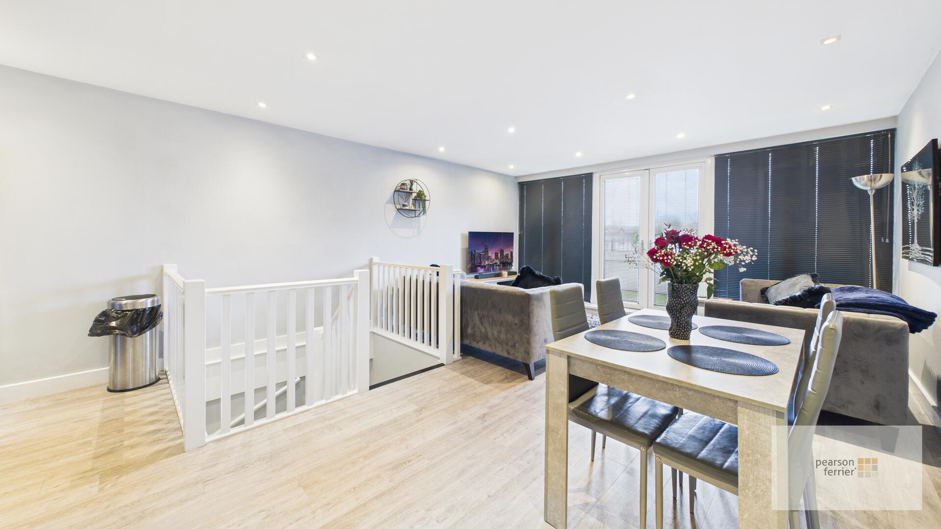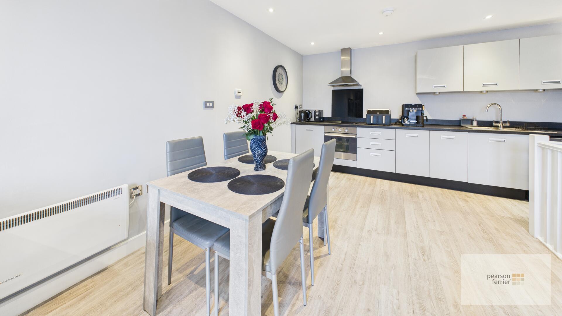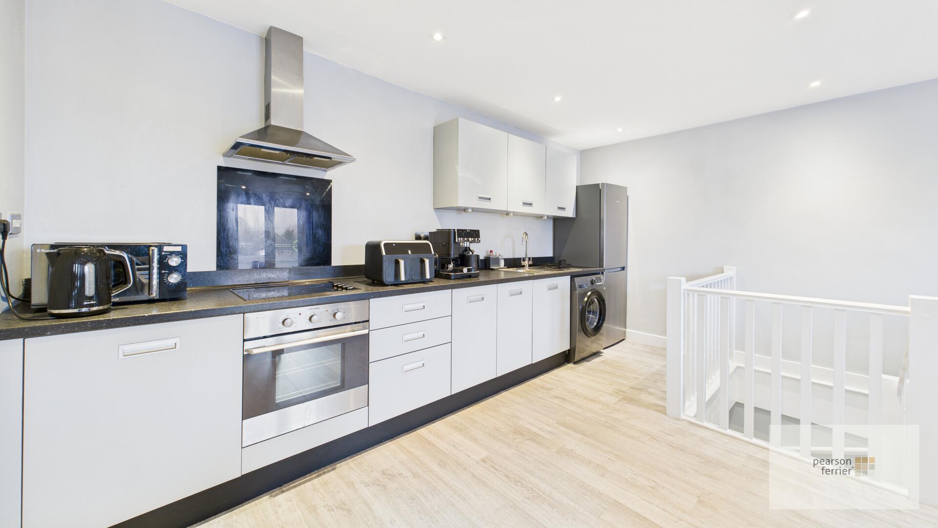 Double glazed windows & French style doors leading to the balcony, spindle balustrade, selection of wall & base units with work surfaces to complement, integrated electric oven & hob with stainless steel extractor hood over, plumbed fort washing machine for fridge/freezer, down lighting and electric wall heaters.