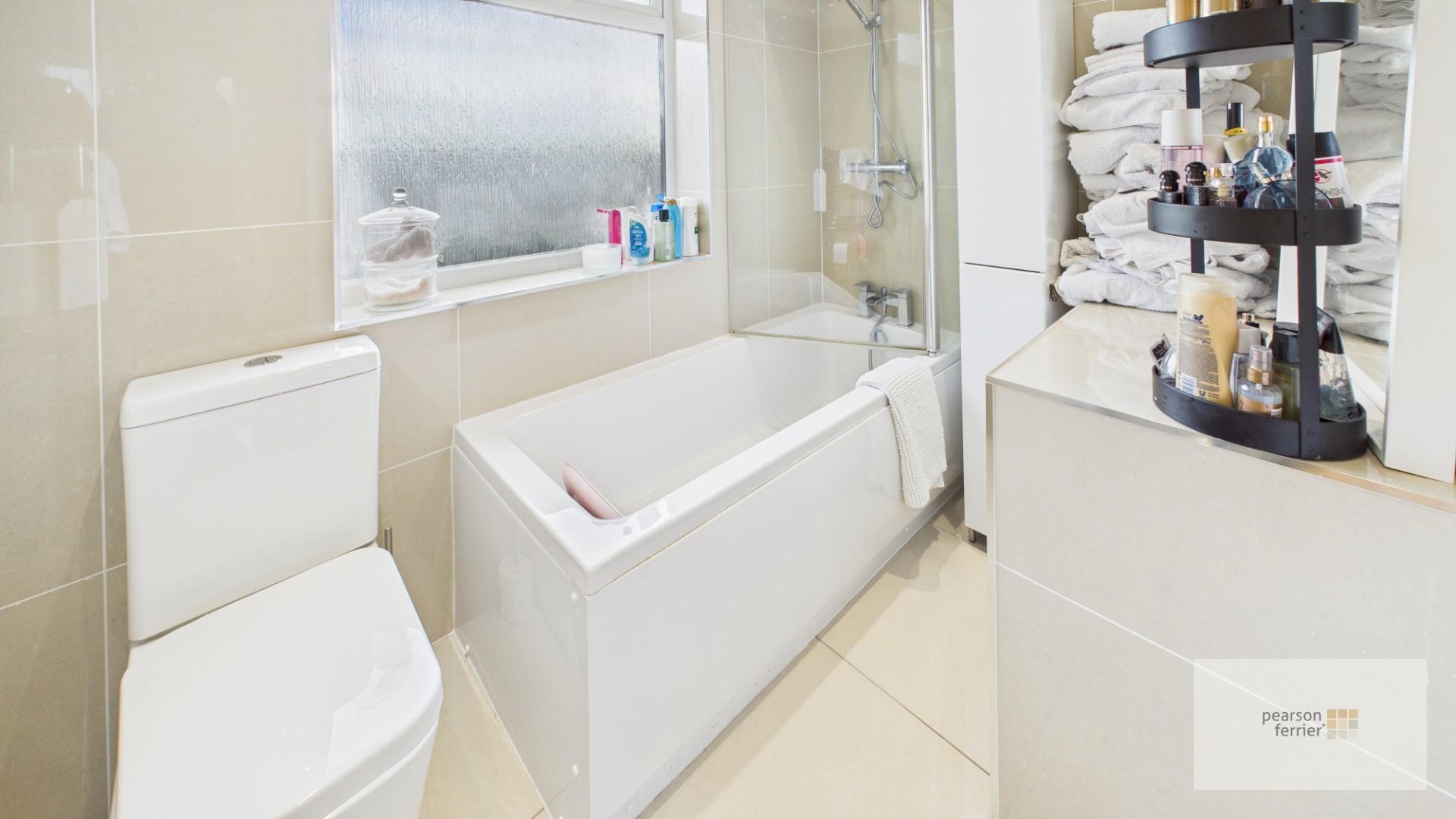 Recently installed three piece suite in white comprising: a low flush w.c., vanity unit wash hand basin and panelled bath with thermostatic shower over. Tiled walls and flooring, upvc double glazed window to the front.