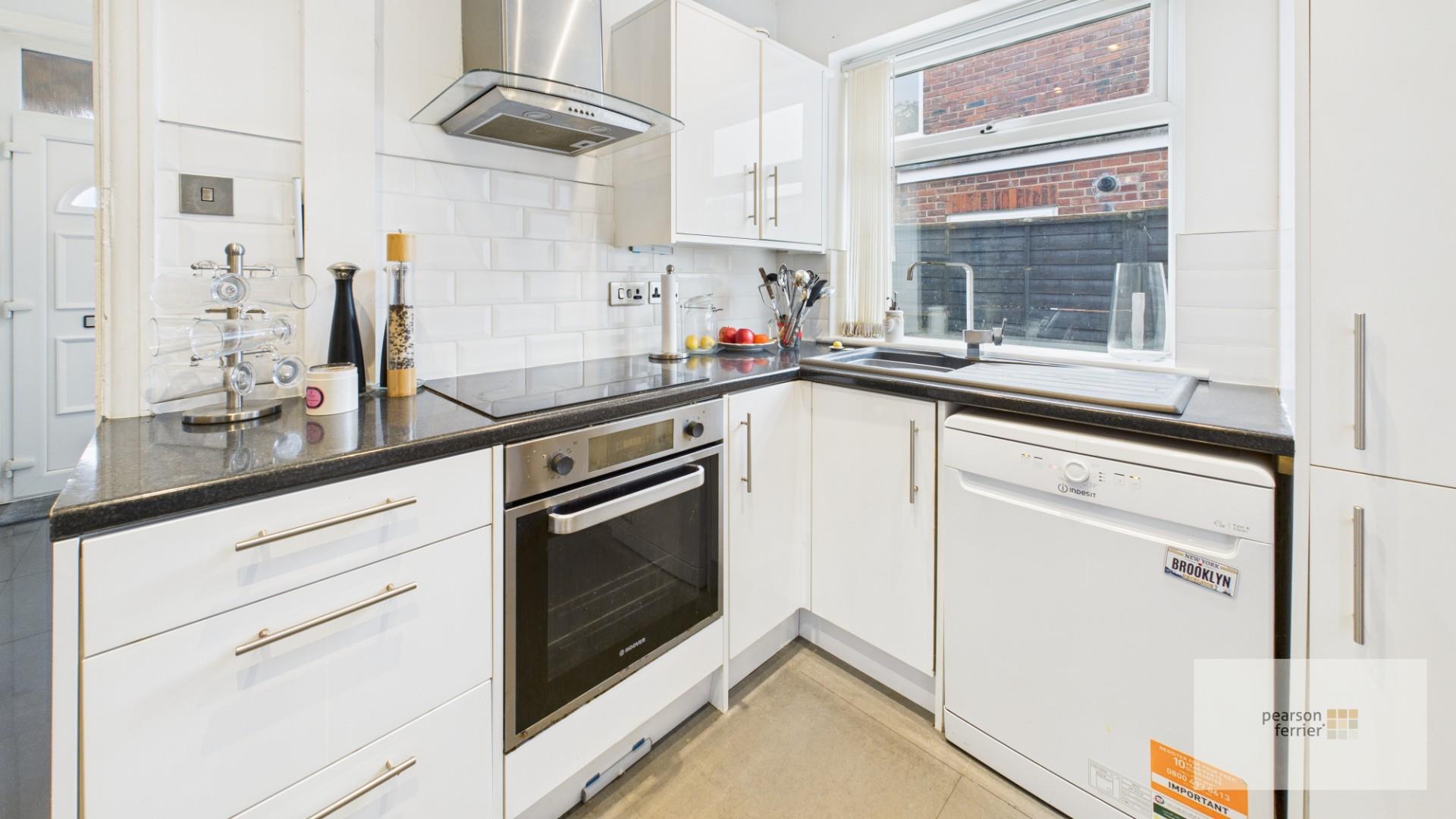 Matching gloss white kitchen with contrasting worktops and integrated stainless steel sink unit. Plumbing for laundry utilities. Tiled flooring and access onto the rear gardens.