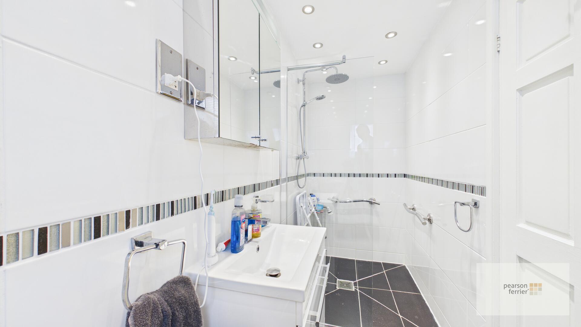 The ensuite shower room is modern and sleek with white and black tiling, a wide vanity unit with sink, and a walk-in shower enclosure, tiled elevations and flooring, heated towel rail, velux window to the side.