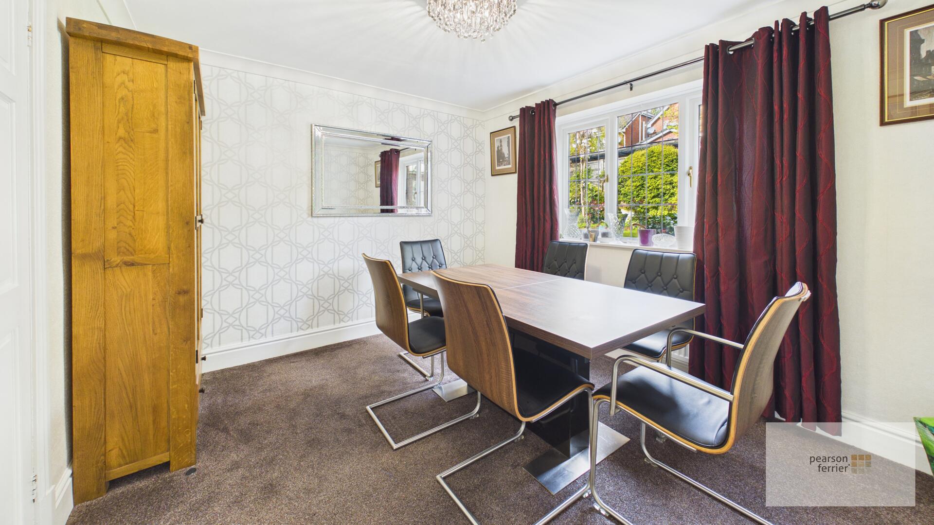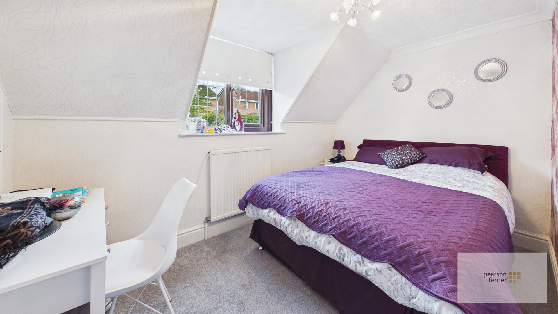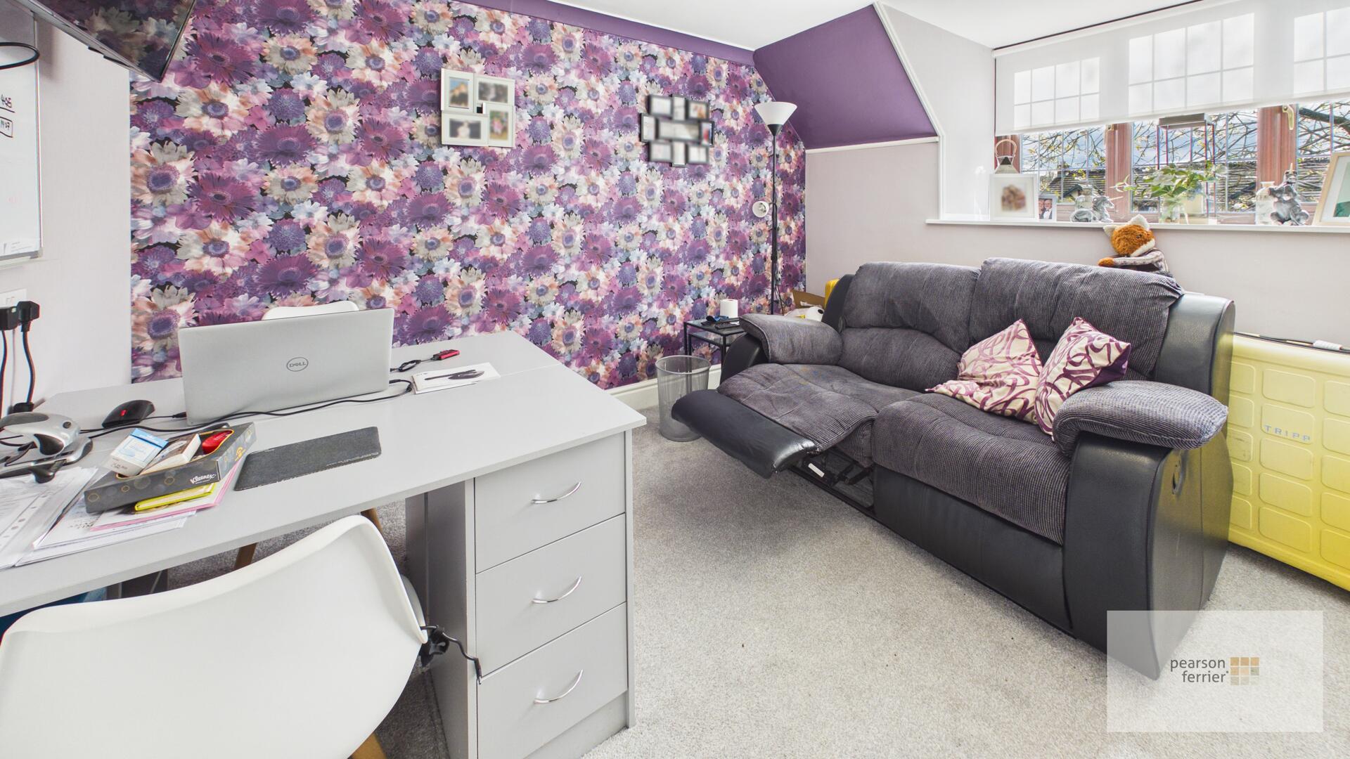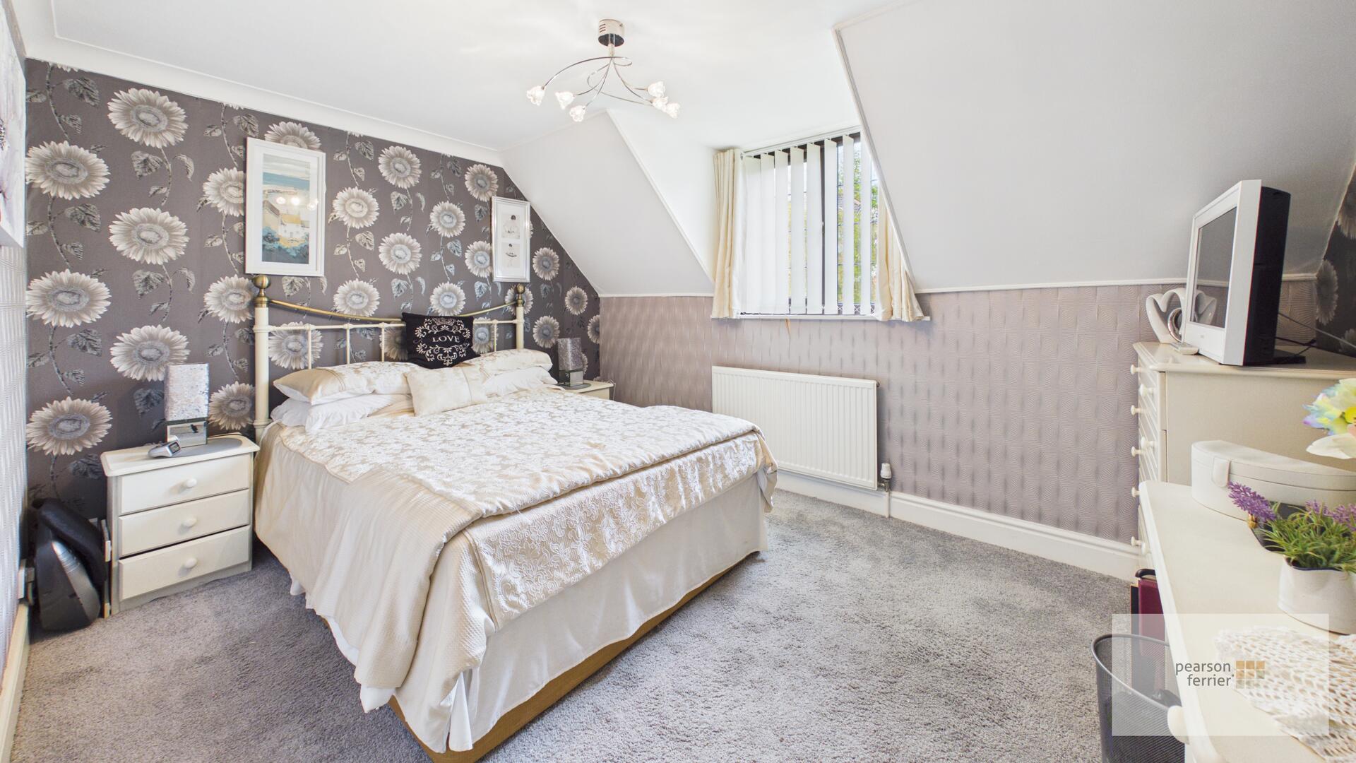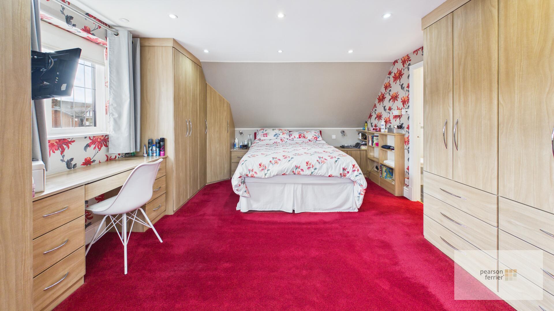The principal bedroom is a generous and comfortable space with a rich red carpet, fitted wardrobes, and a dressing area with a window overlooking the front.