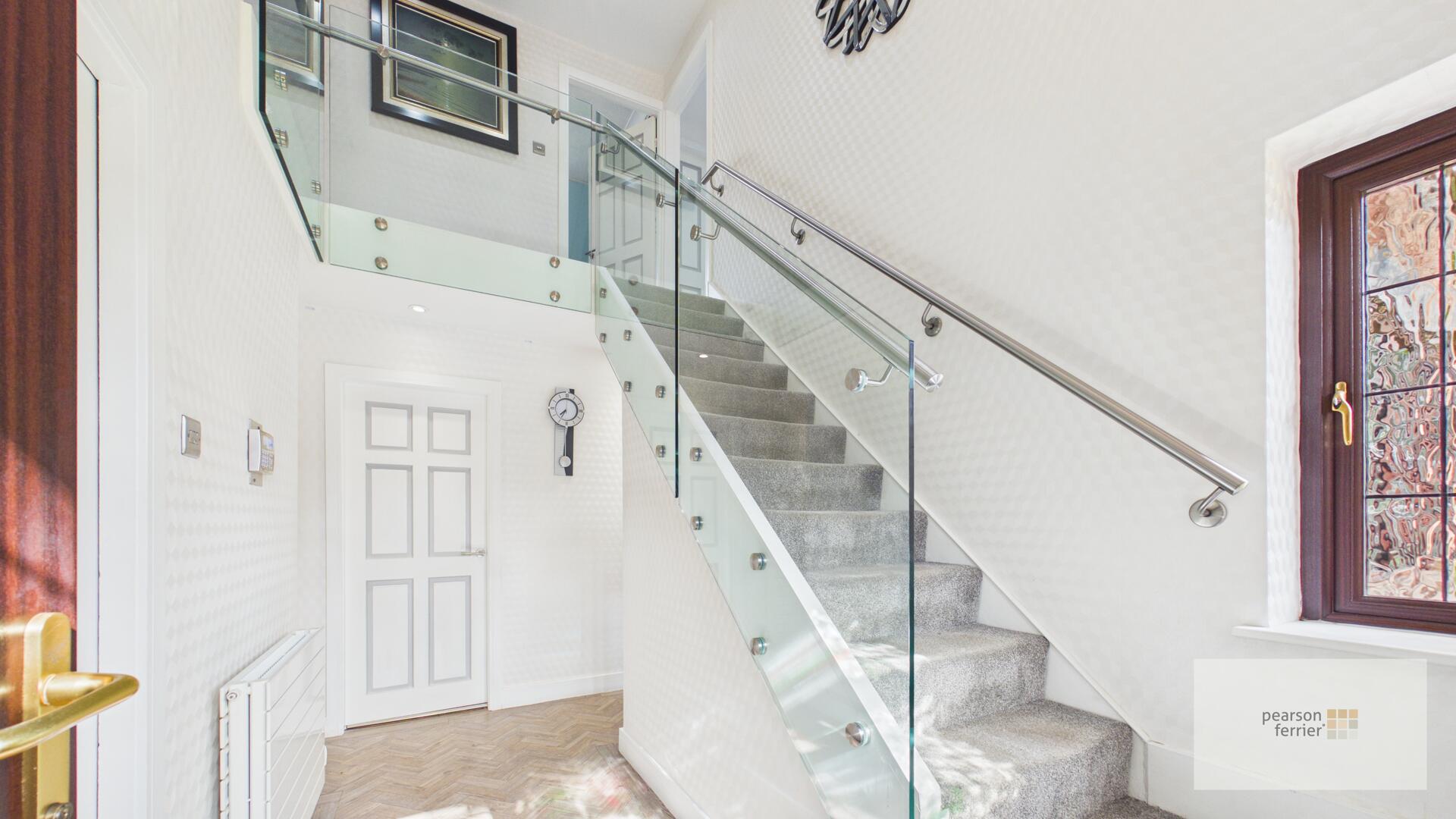Entrance porch leading into a spacious hallway with stairs to the first floor galleried landing with glass balustrade, wc/cloaks and access into the double garage.