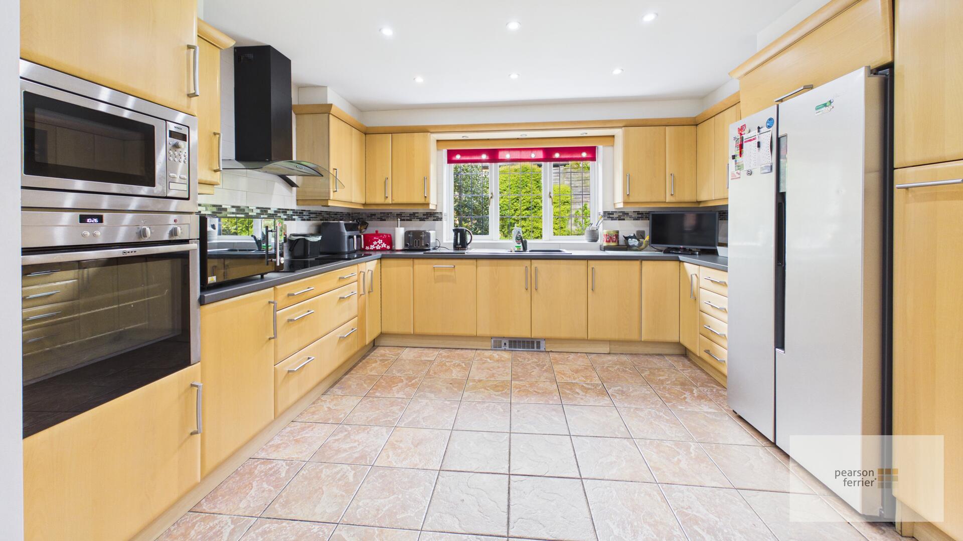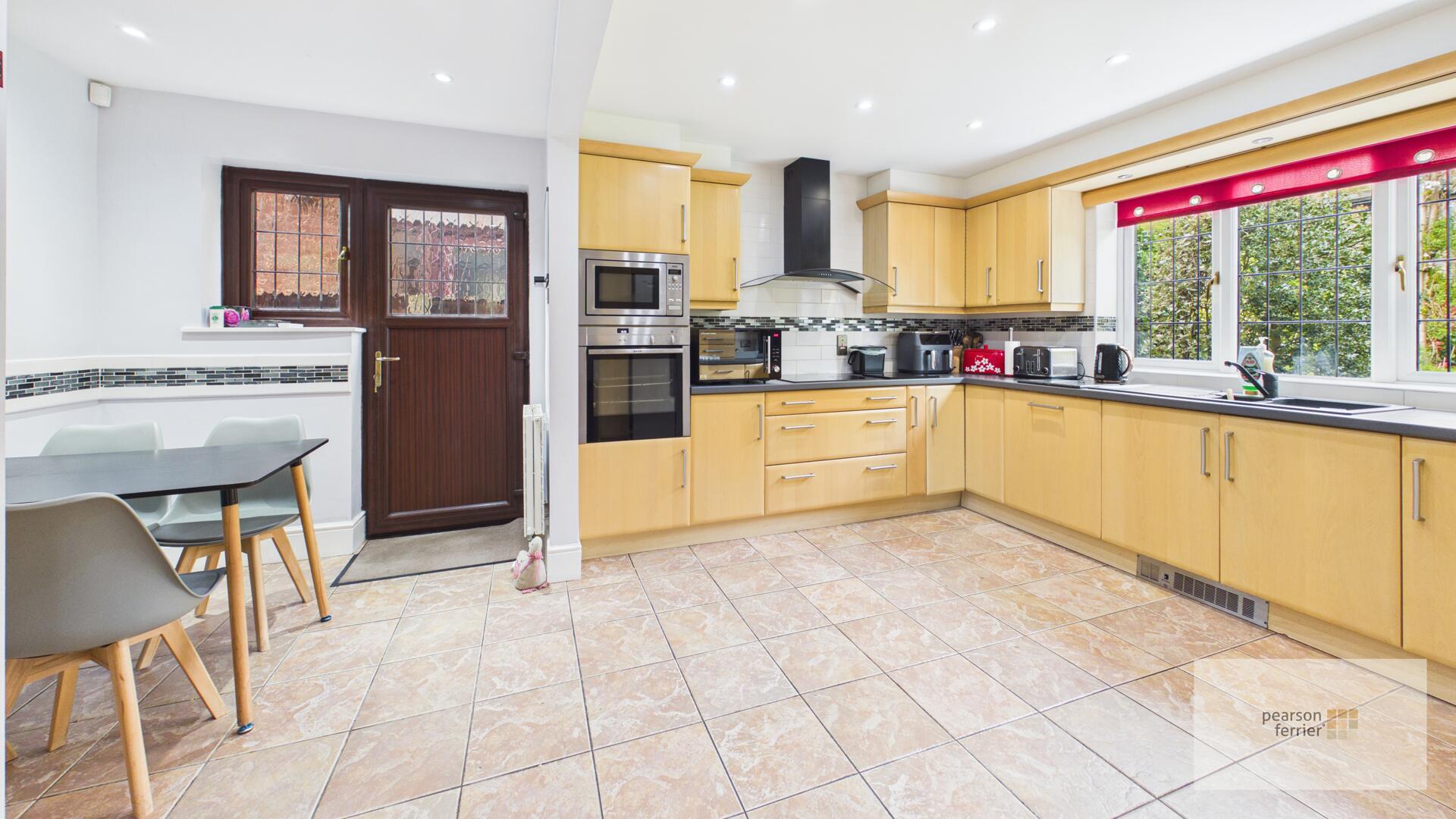 The kitchen is bright and practical with tiled flooring, light wood cabinets, and complimentary black countertops. It includes integrated appliances, and a handy breakfast area next to a door leading outside and window to the rear.