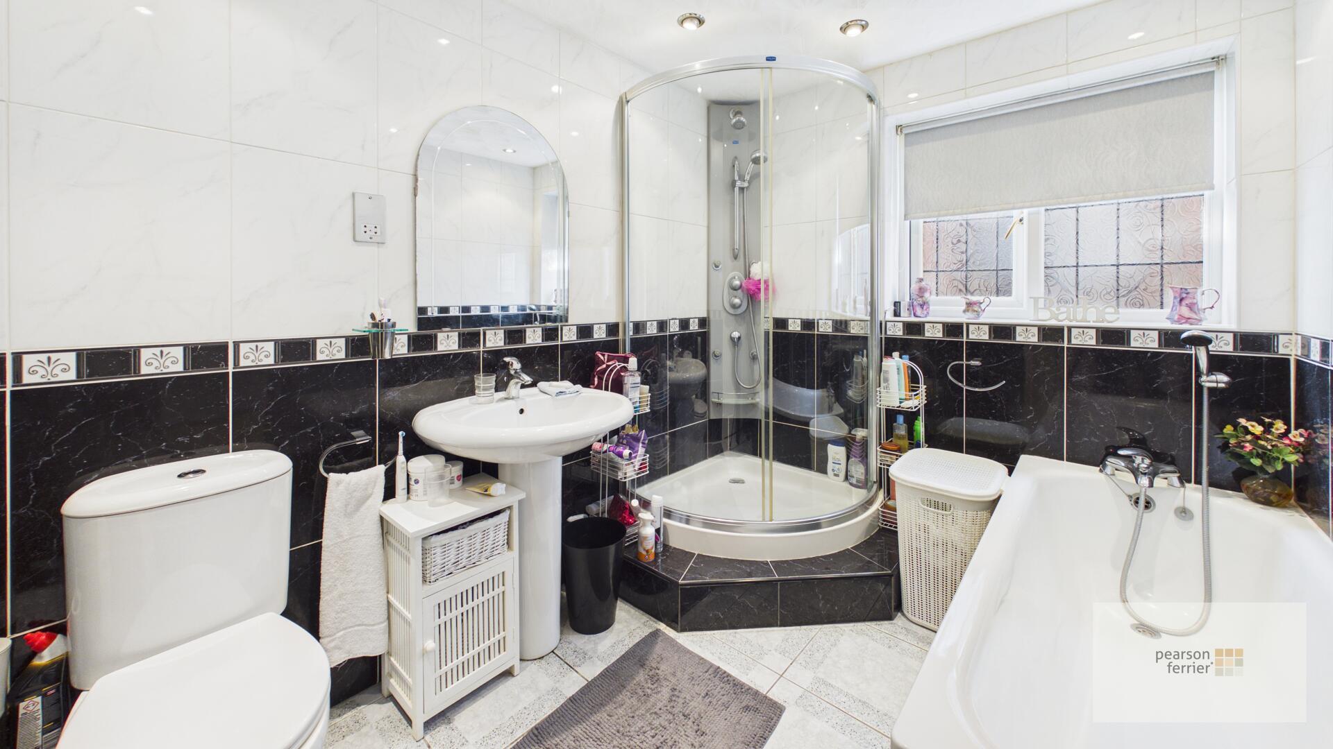 The family bathroom is spacious with a black and white tiled theme, including a corner shower unit, a large bathtub, a pedestal sink, and a toilet. It combines comfort and style with ample natural light from the window.