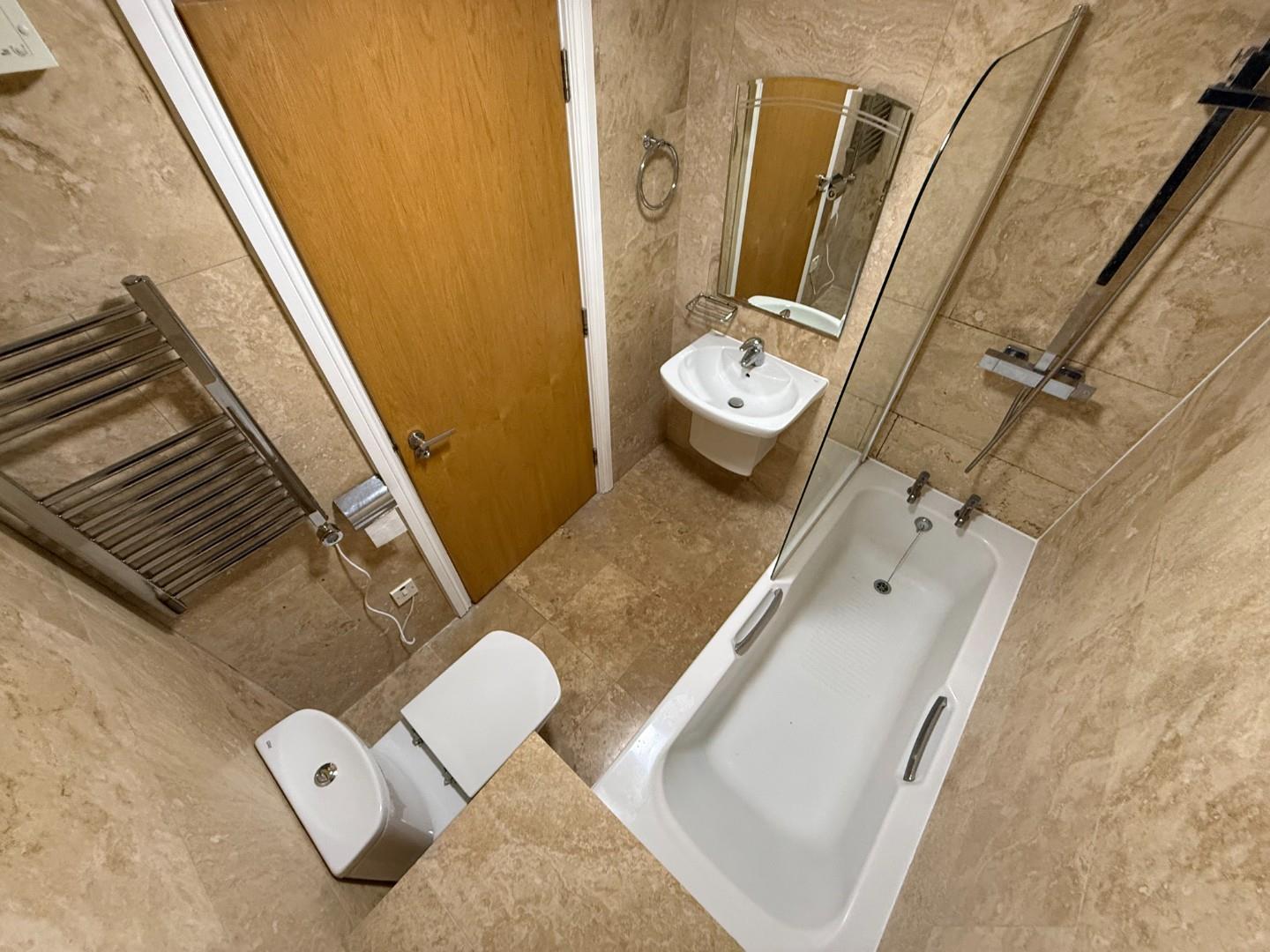 Three piece white suite comprising of; Low level w.c, wall mounted hand wash basin and panel bath with shower over, heated towel rail, ceiling light point and extractor fan.
