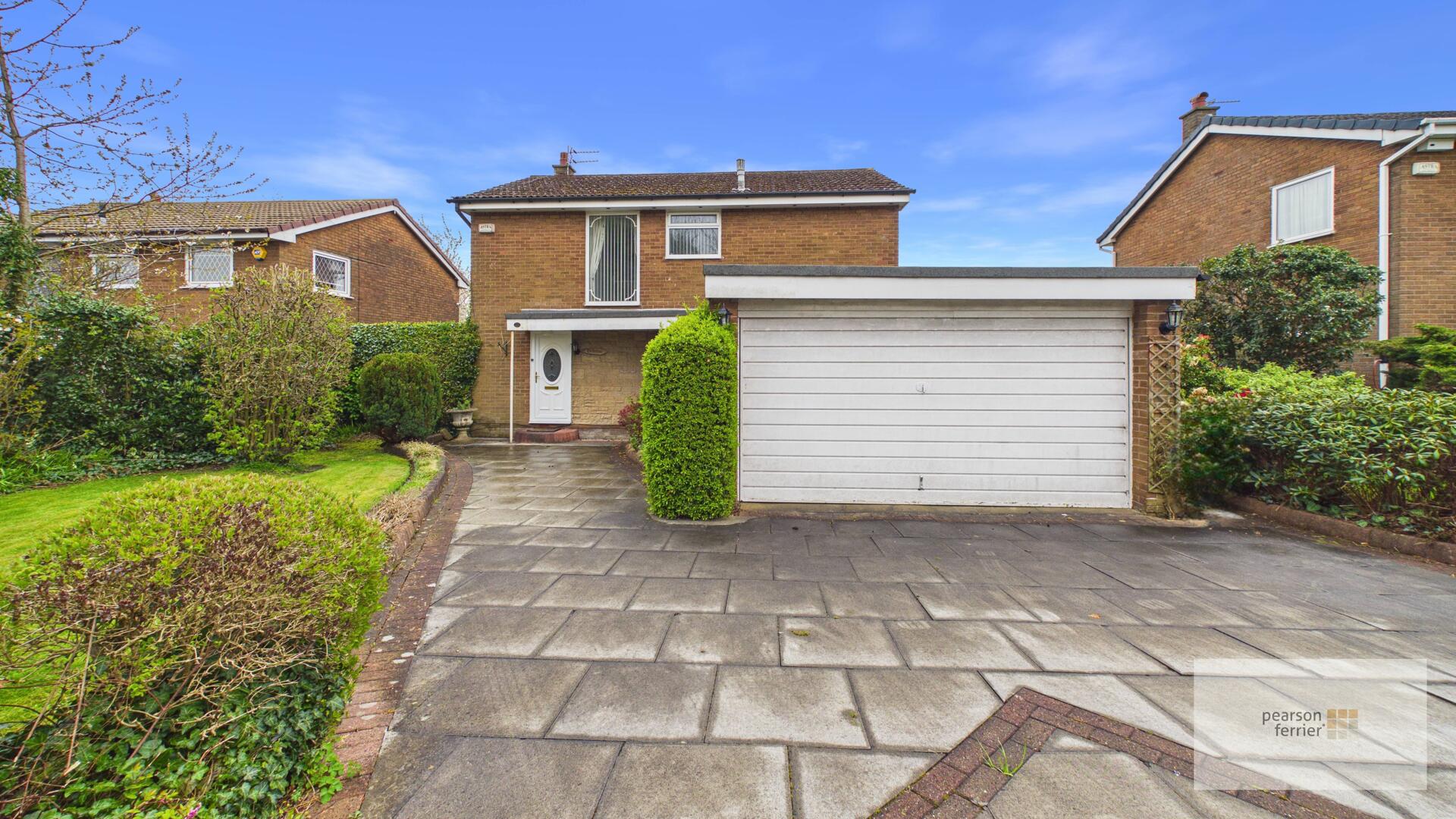 Paved driveway leading to the double garage, laid to lawn with mature planted borders.