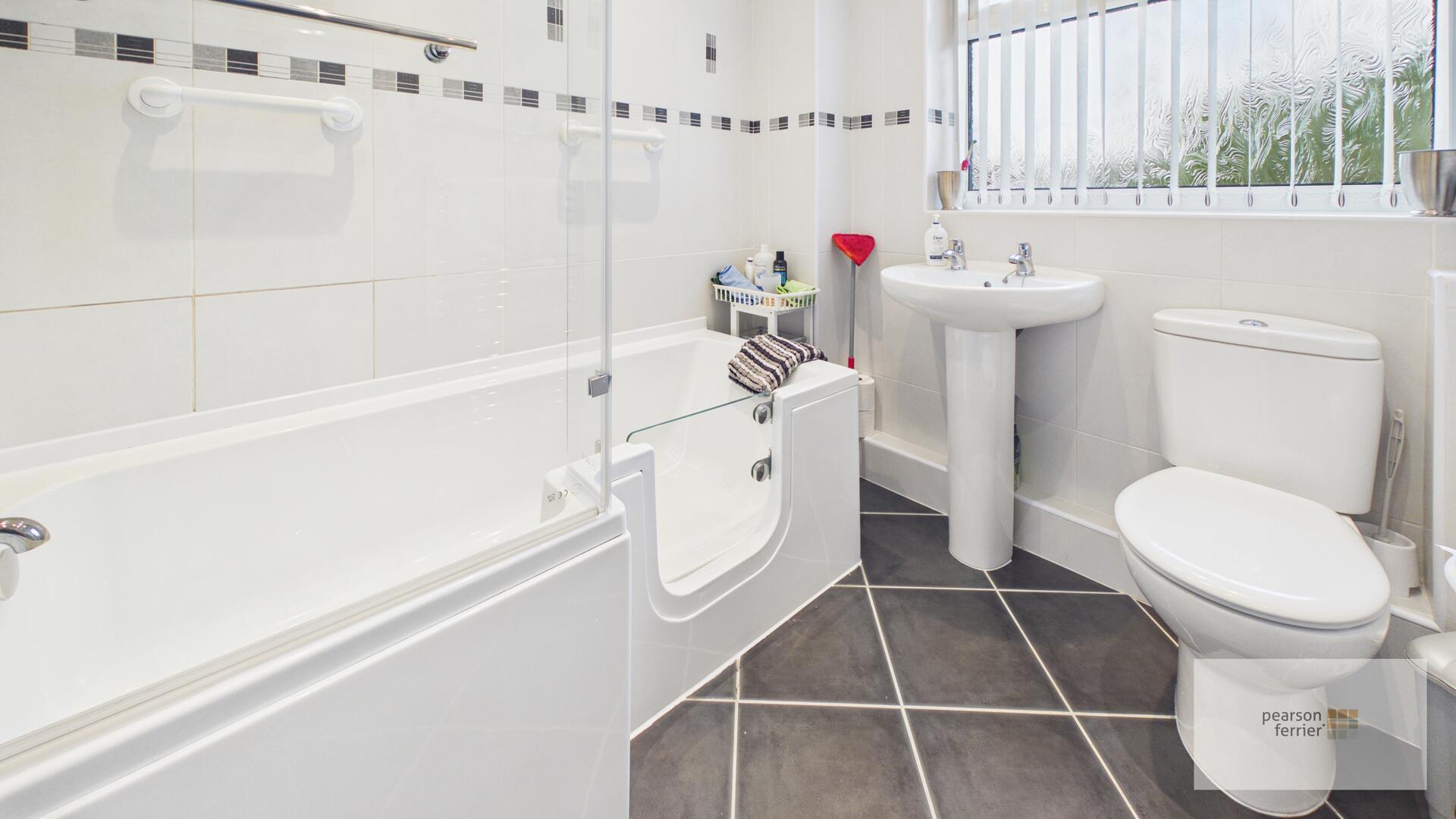 Double glazed frosted window to the front, three piece suite comprising of; Low level w.c, pedestal hand wash basin and & panel bath with shower over, tiled floor and elevations, chrome heated towel rail and down lighting.