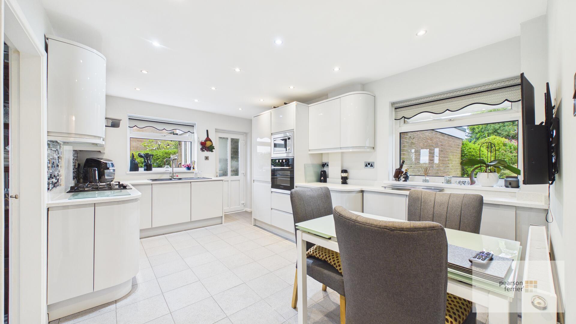 Double glazed window to the front & side with upvc door access to the side, selection of wall & base units with work surfaces to complement, integrated fridge/freezer, dishwasher, microwave, electric oven and gas hob with extractor hood over, one & half sink & drainer, tiled splash back, down lighting and radiator.