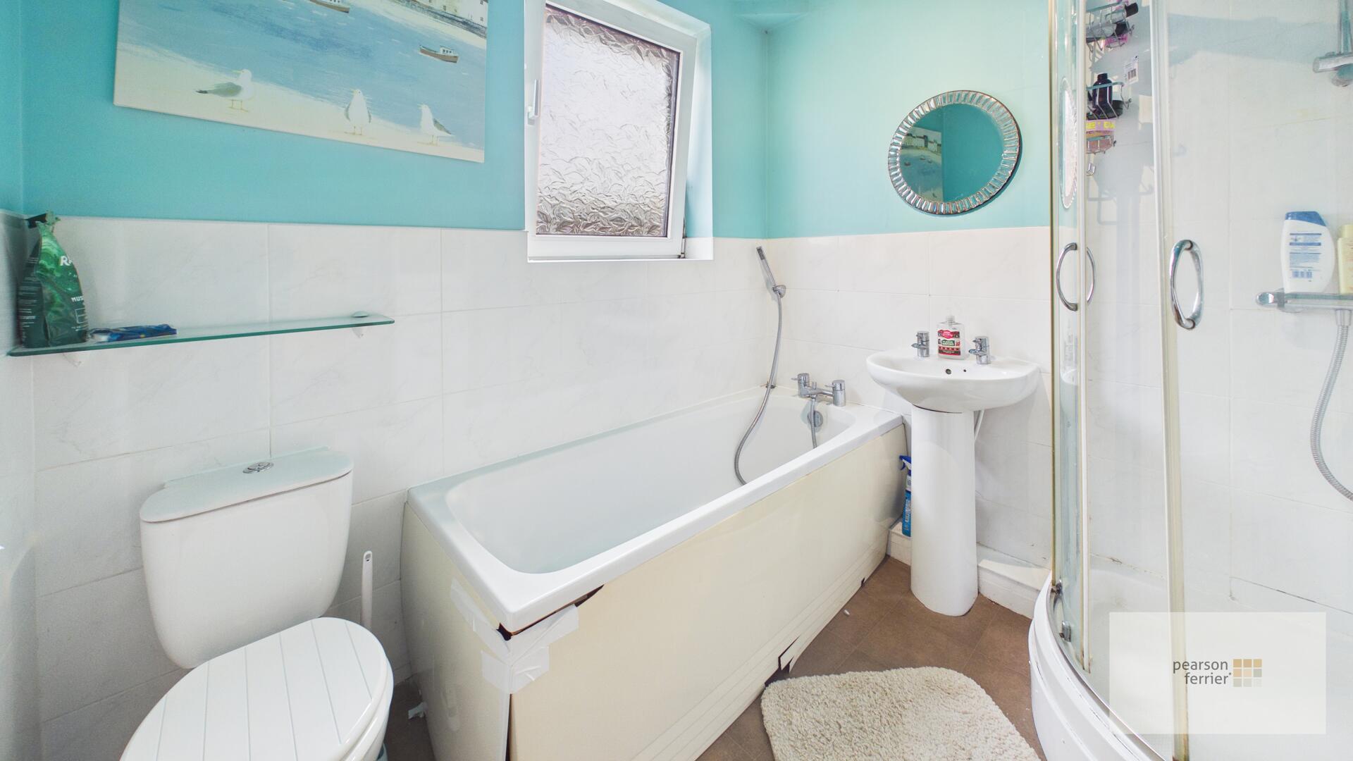 Four piece bathroom comprising of; Low level w.c, pedestal hand wash basin, panel bath and shower cubicle, heated towel rail, ceiling light point and double glazed frosted window to the rear.