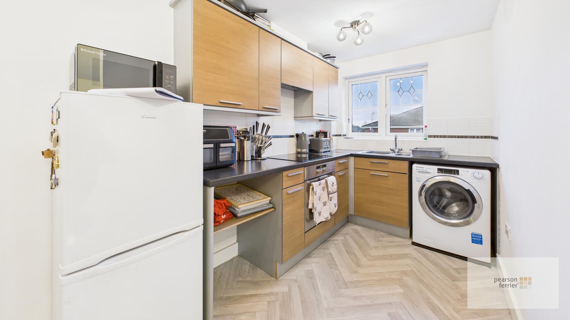 The kitchen features a practical layout with wood-effect wall and base units, it is fitted with essential appliances including an oven, electric hob, fridge-freezer, tiled elevations, window to the side.