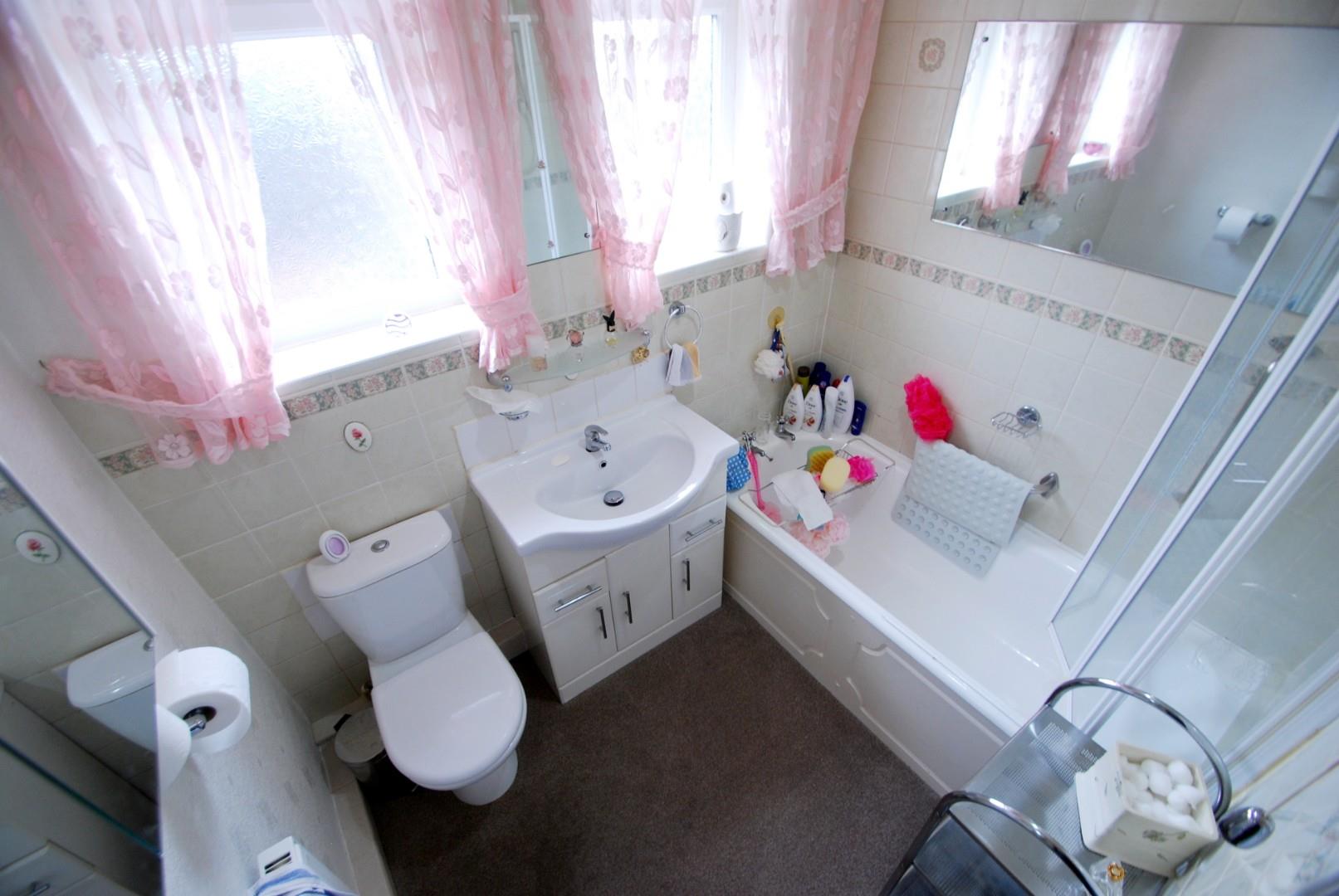 Two double glazed frosted window to the rear, three piece white suite comprising of; Low level w.c, hand wash basin set in vanity unit and panel bath with shower over, tiled elevations, ceiling light point and radiator.