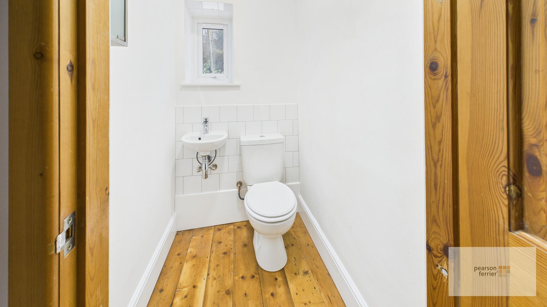 The shower room is compact and functional, featuring a walk-in shower enclosure with white tiled walls. It also includes a traditional high-level cistern toilet and a small wash basin and heated towel rail.