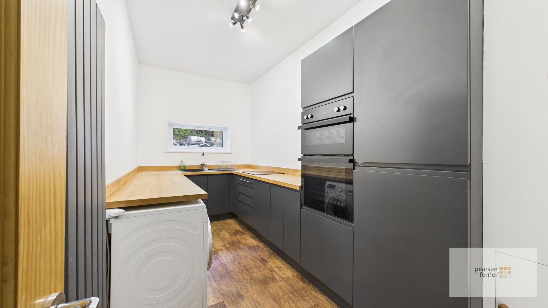 The kitchen is well designed with modern grey cabinetry paired with wood-effect work surfaces and flooring, creating a sleek and functional space. It includes built-in appliances such as an oven and hob, fridge and freezer, with a window providing natural daylight.