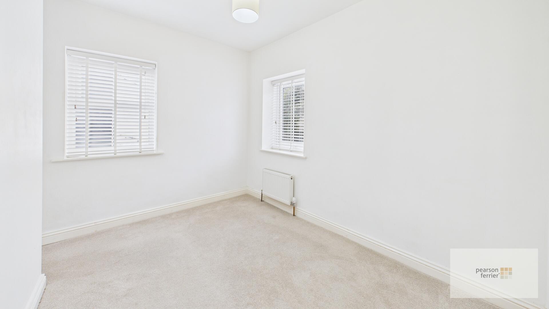 The main bedroom is a spacious and bright room with light carpeted flooring and white walls, windows to the front and side.
