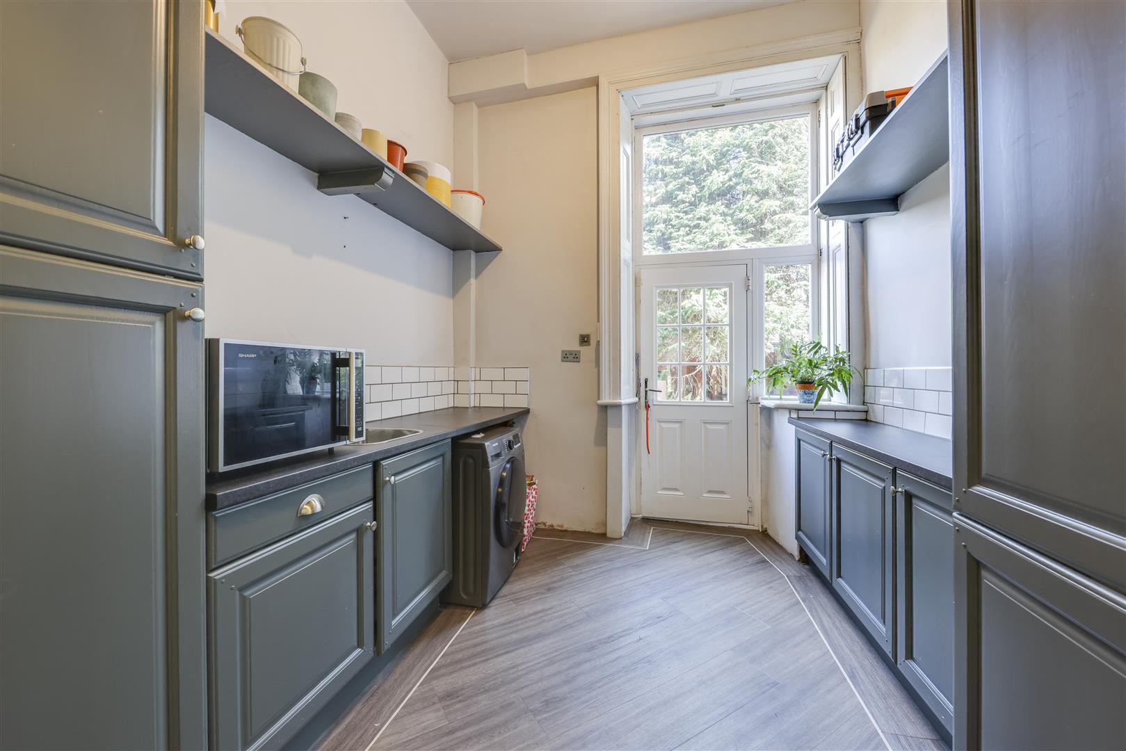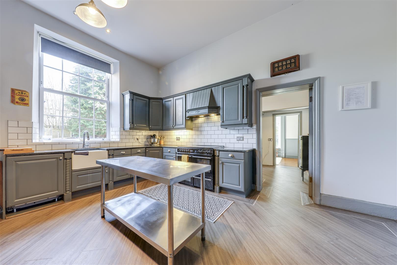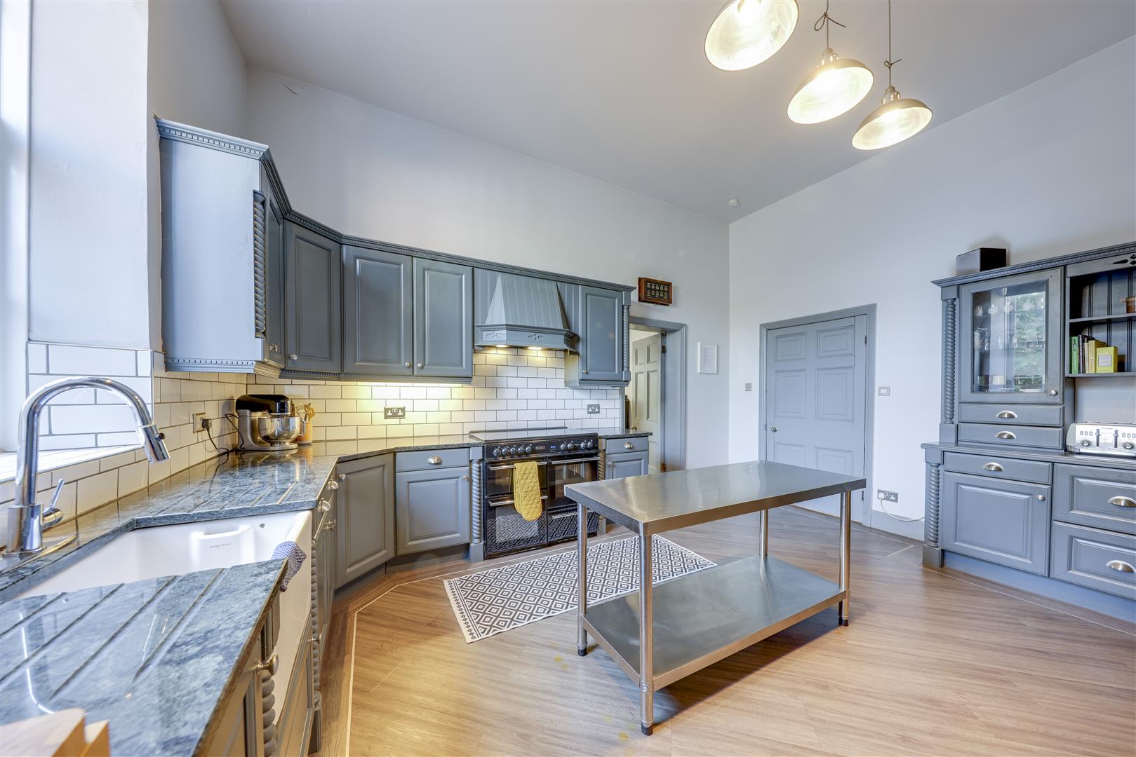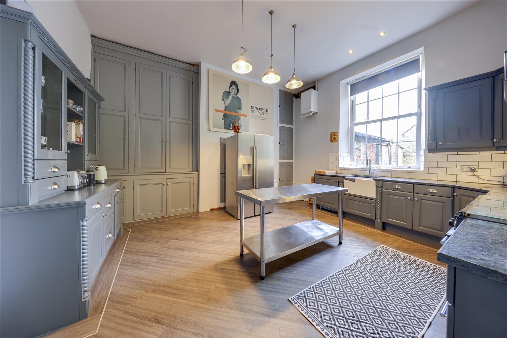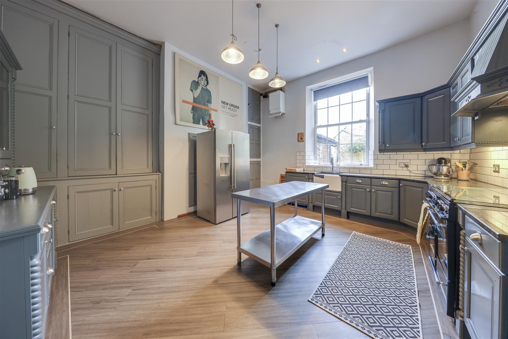 A comprehensive range of wall & base units in grey finish with complementary polished granite worktops incorporating a 'Belfast' sink unit. Original built in kitchen storage cupboards and matching dresser. Signature 'Karndean' style flooring and window overlooking the rear patio area.