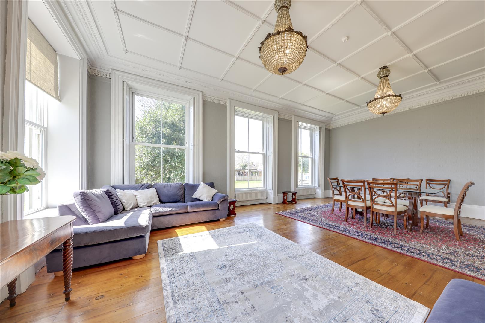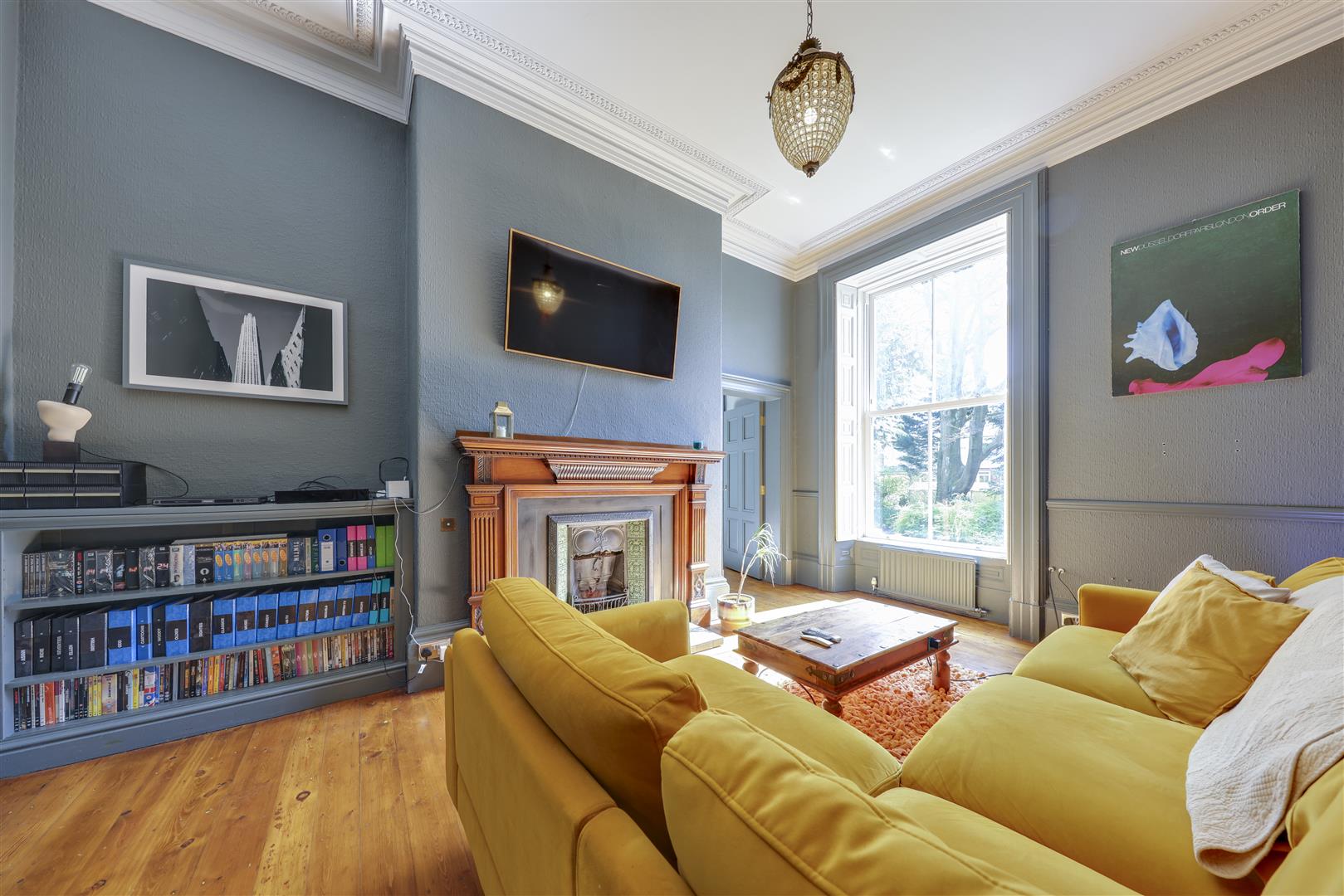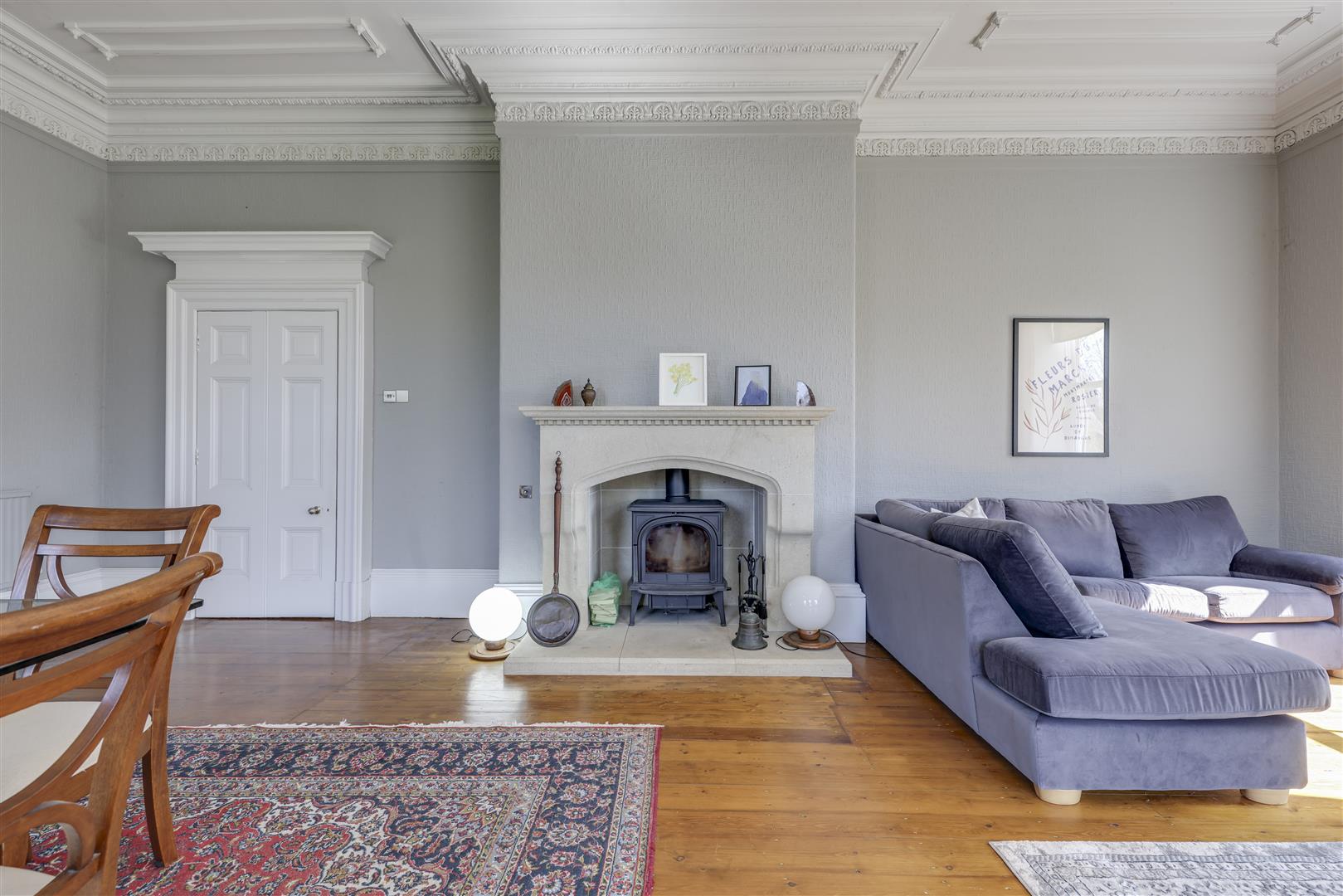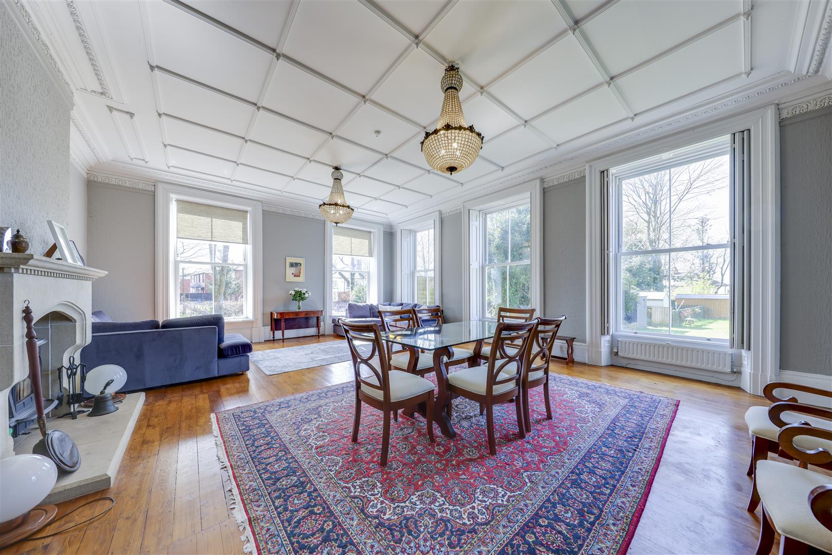 A very impressive formal drawing room with original ceiling detailing, stripped and polished timber floors, bespoke stone built fireplace housing a log burner and five almost floor to ceiling upvc sash windows with shutters, providing views over the adjacent gardens.