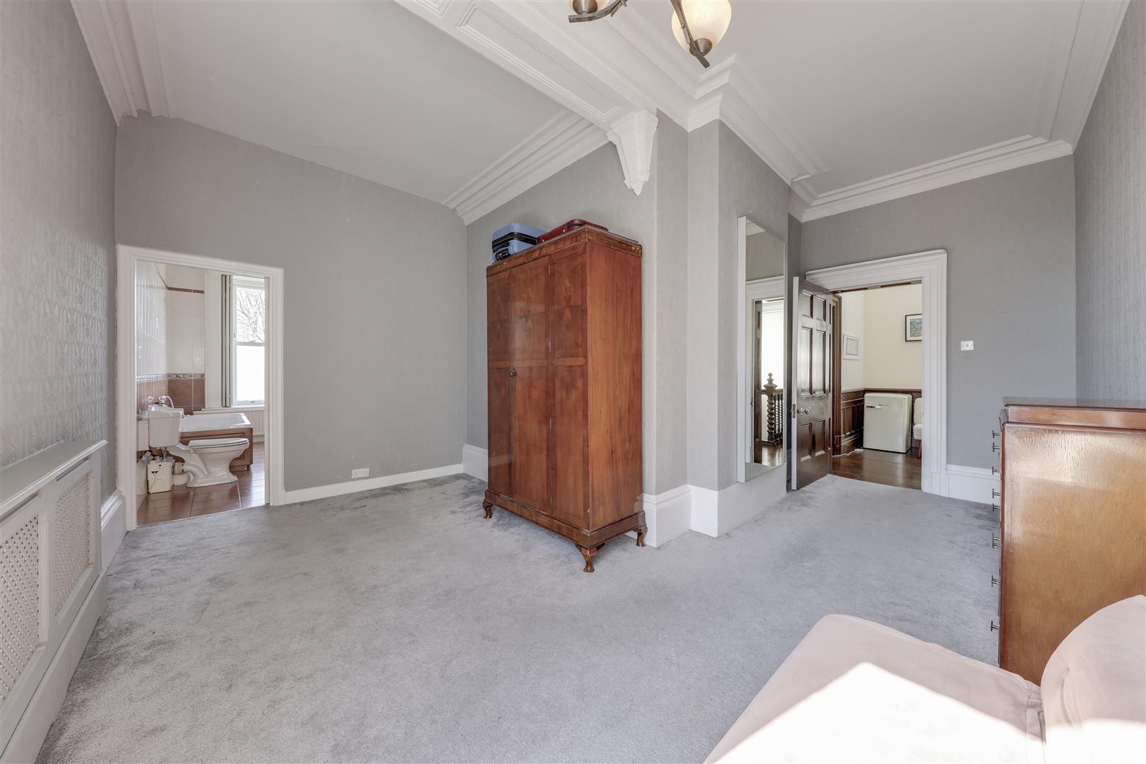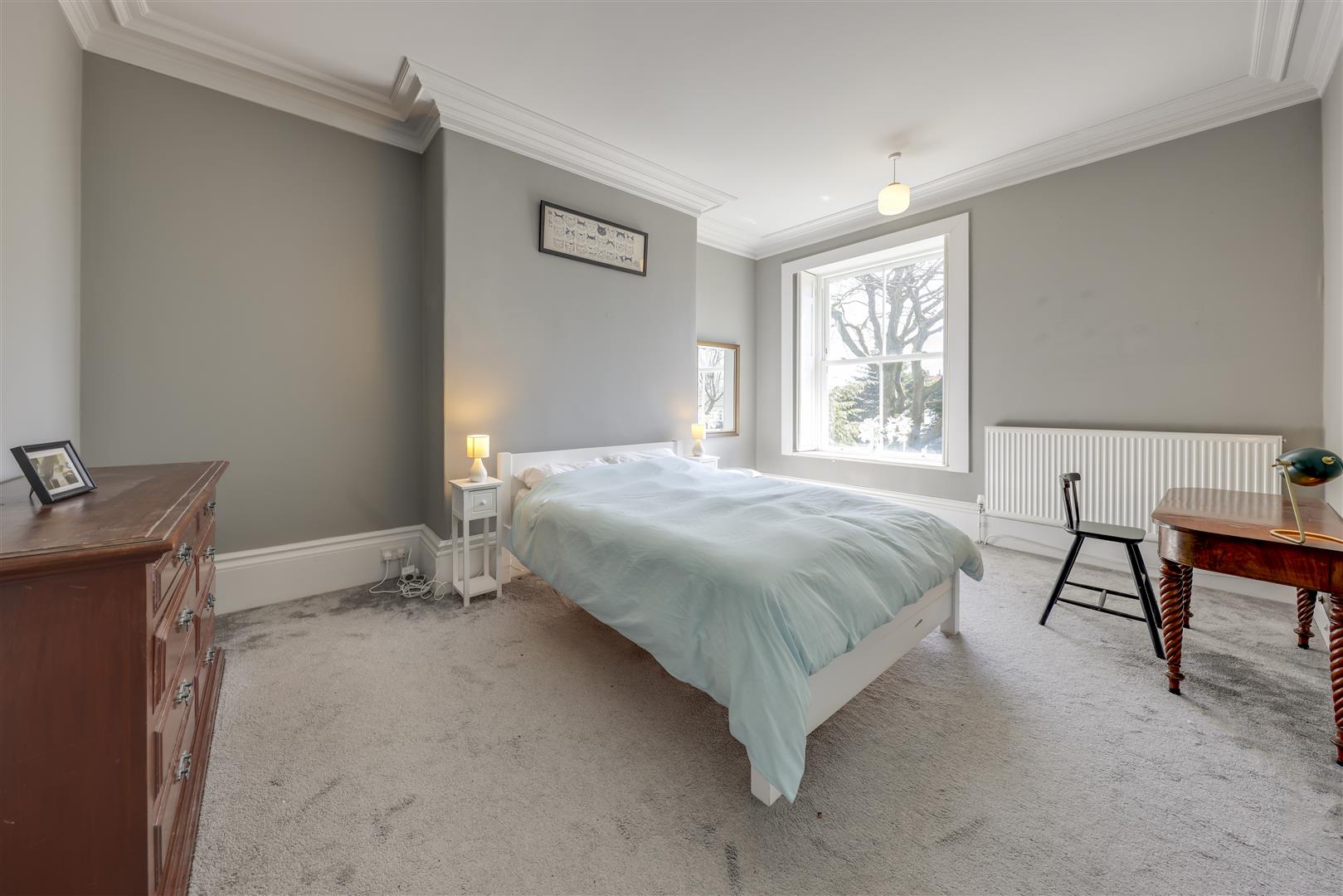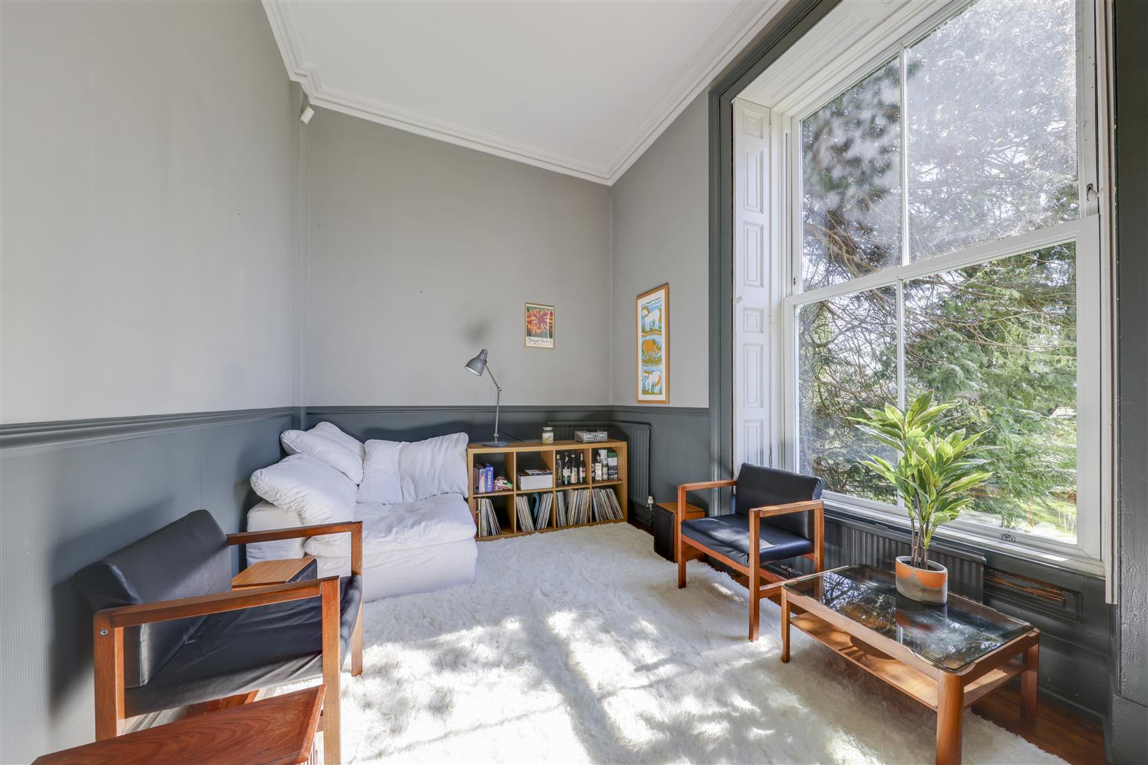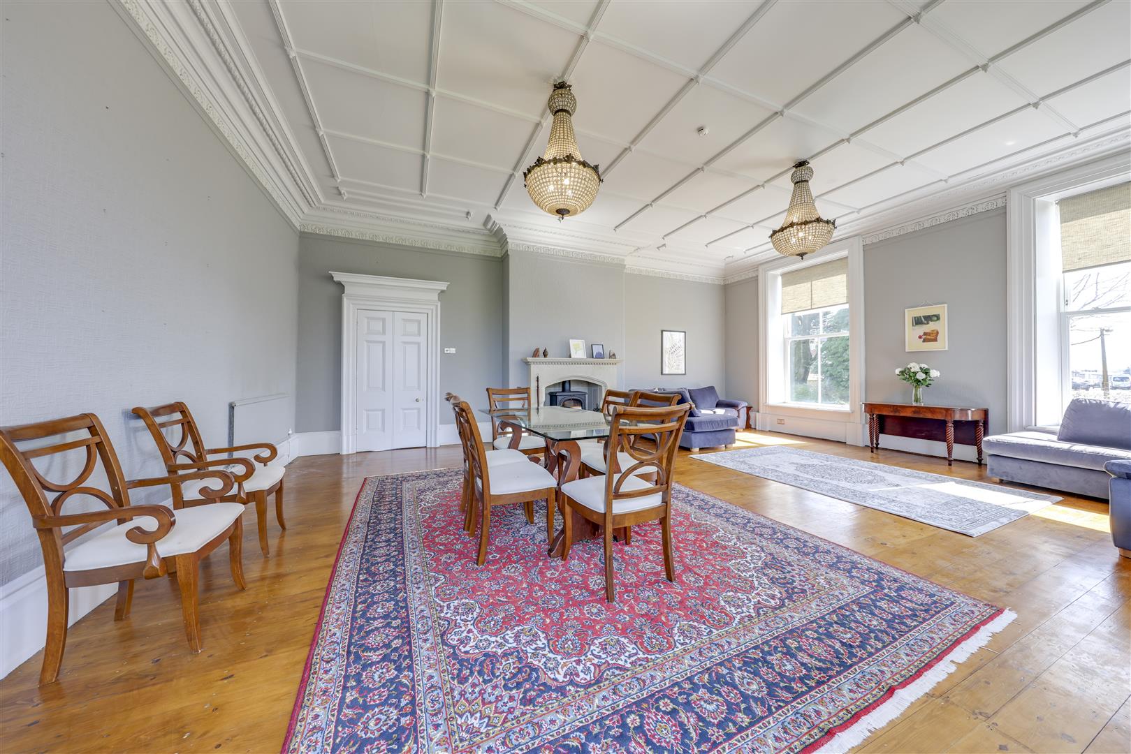 A very impressive formal drawing room with original ceiling detailing, stripped and polished timber floors, bespoke stone built fireplace housing a log burner and five almost floor to ceiling upvc sash windows with shutters, providing views over the adjacent gardens.