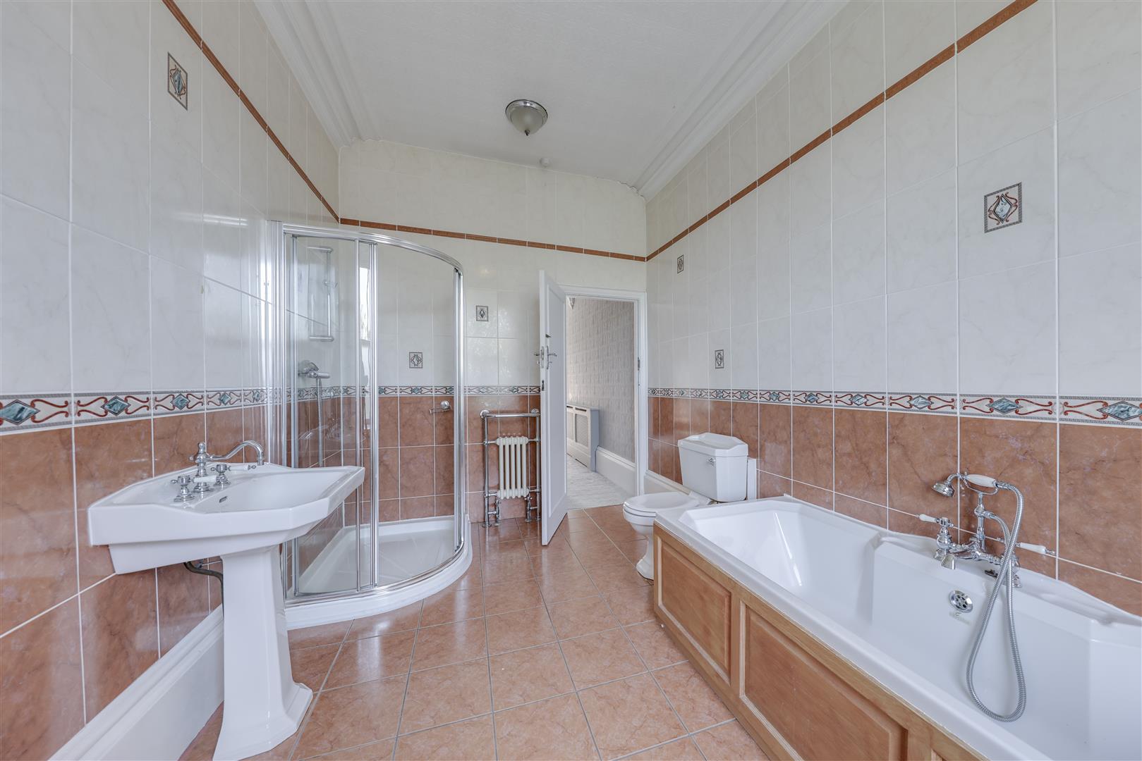 Four piece suite comprising: a low flush w.c., panelled bath with centre taps, wash hand basin and shower cubicle with thermostatic shower. Two tone tiling and sash window.