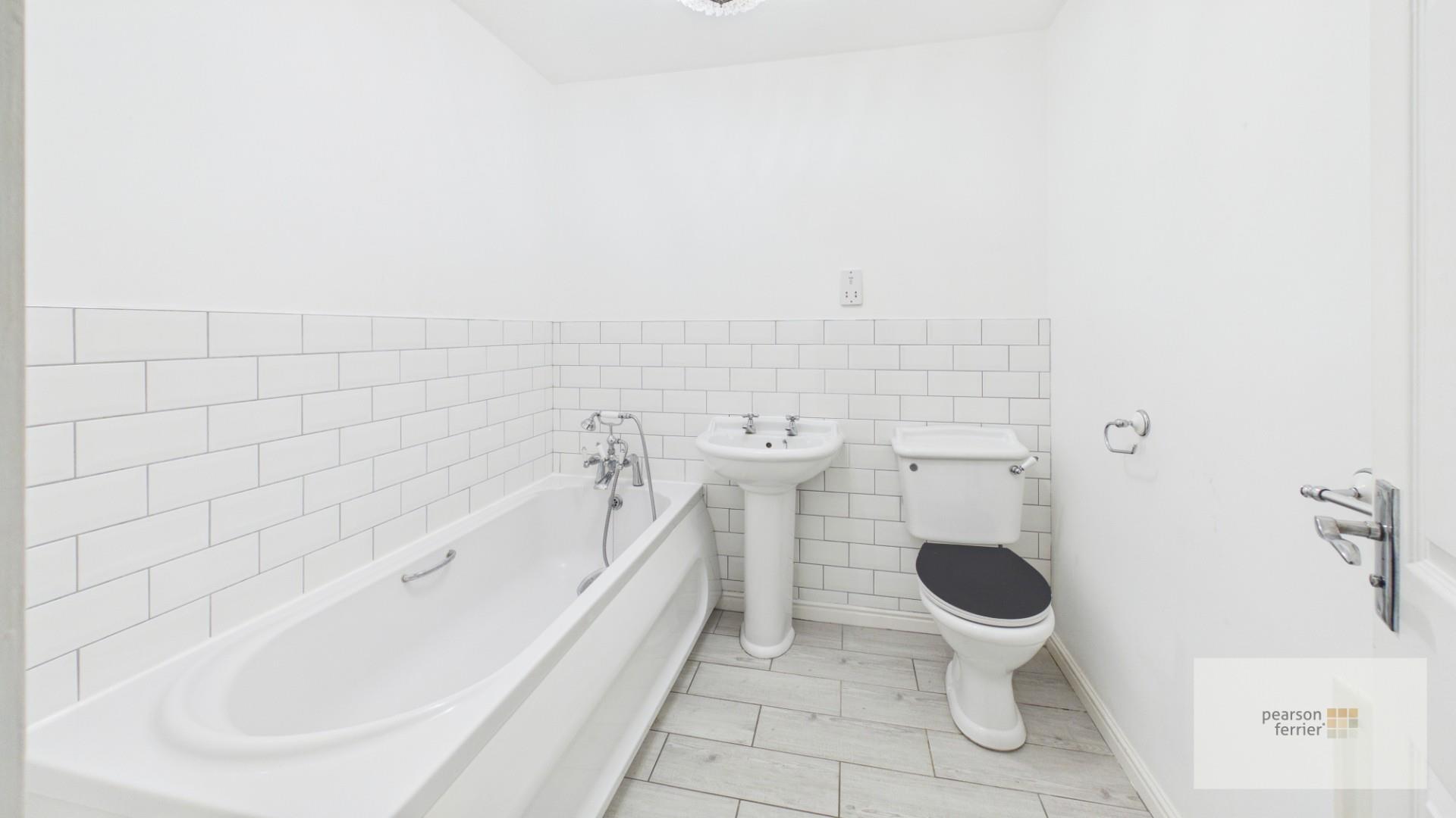 Comprising, wc, wash hand basin and panel bath with shower attachment, tiled elevations and flooring.
