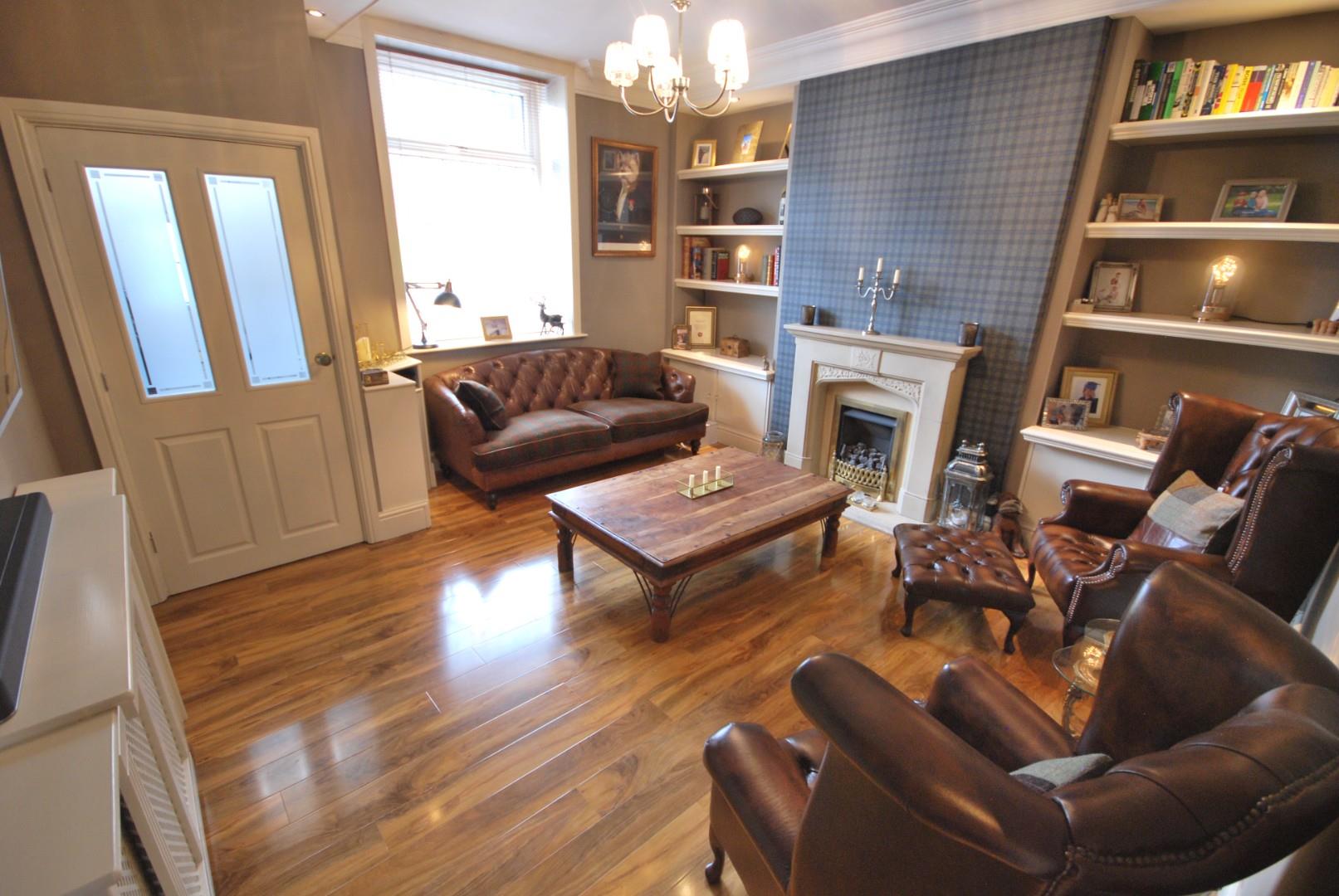 Vestibule entrance, oak style flooring, recessed living flame gas fire, window to the front.