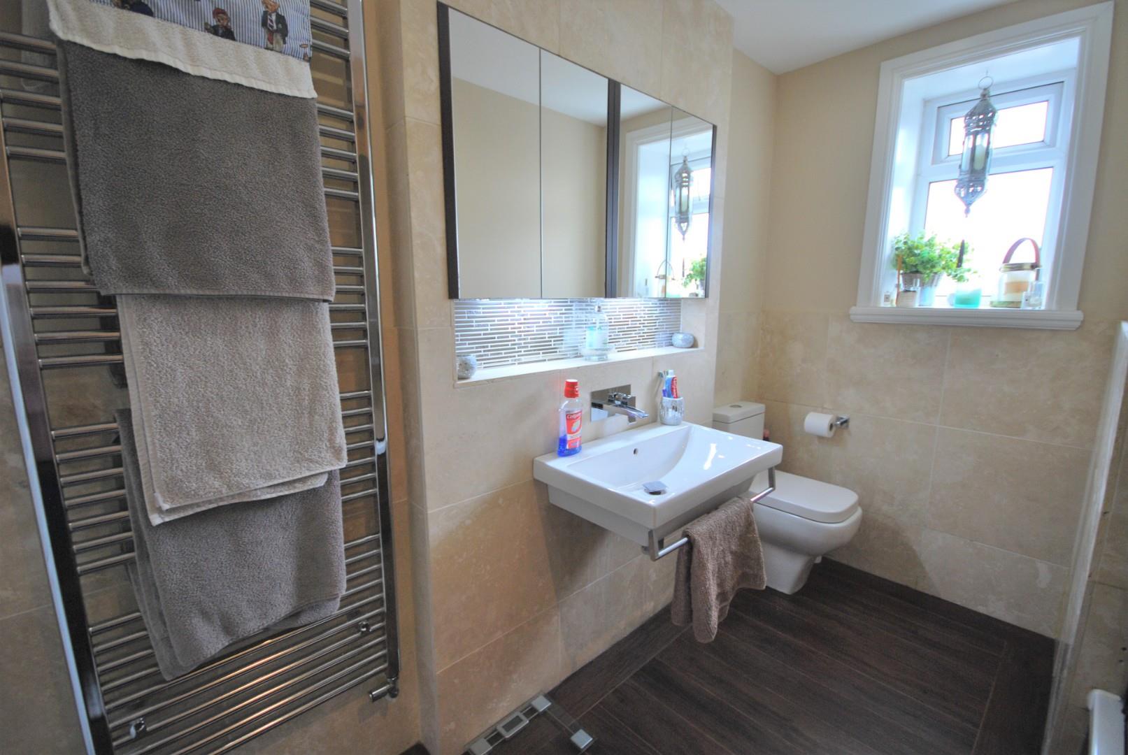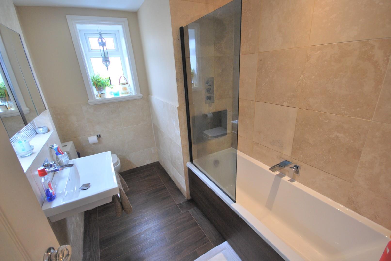 Contemporary suite comprising, wc, wall mounted basin, panel bath with shower over, tiled elevations, recessed TV, heated towel rail, dark oak vinyl flooring, window to the rear.