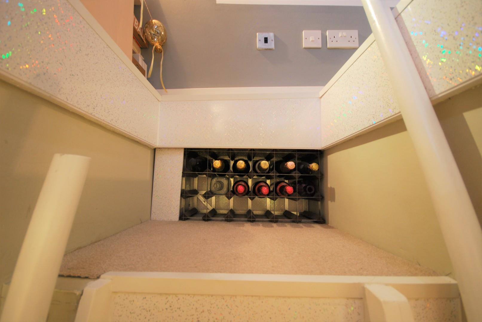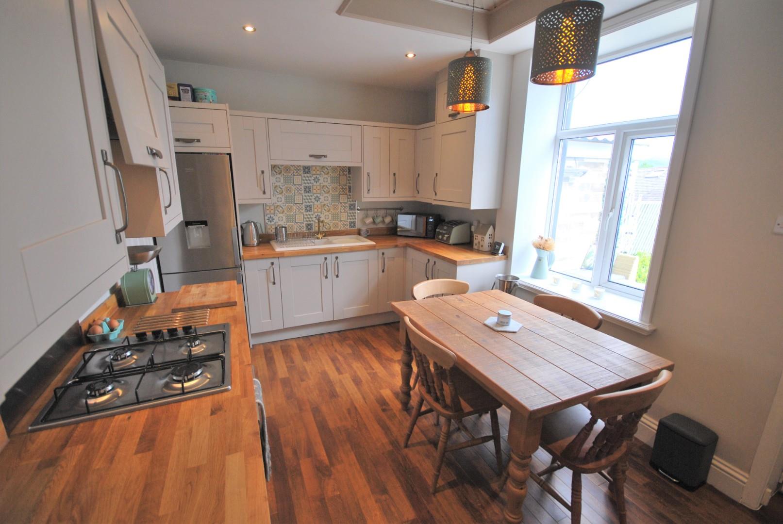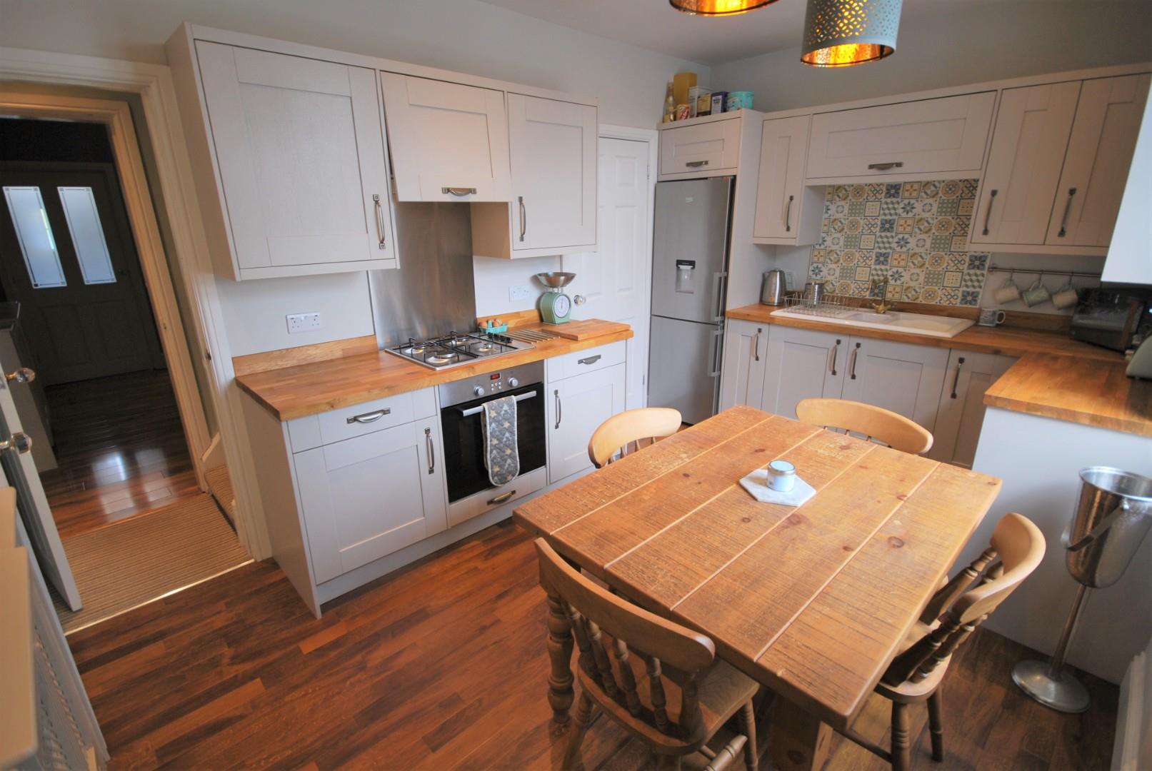 Stylish Shaker style kitchen with range of wall and base units, with complimentary oak worktops, built in gas hob, oven and extractor, tiled elevations, oak vinyl flooring, understairs storage, window to the rear.