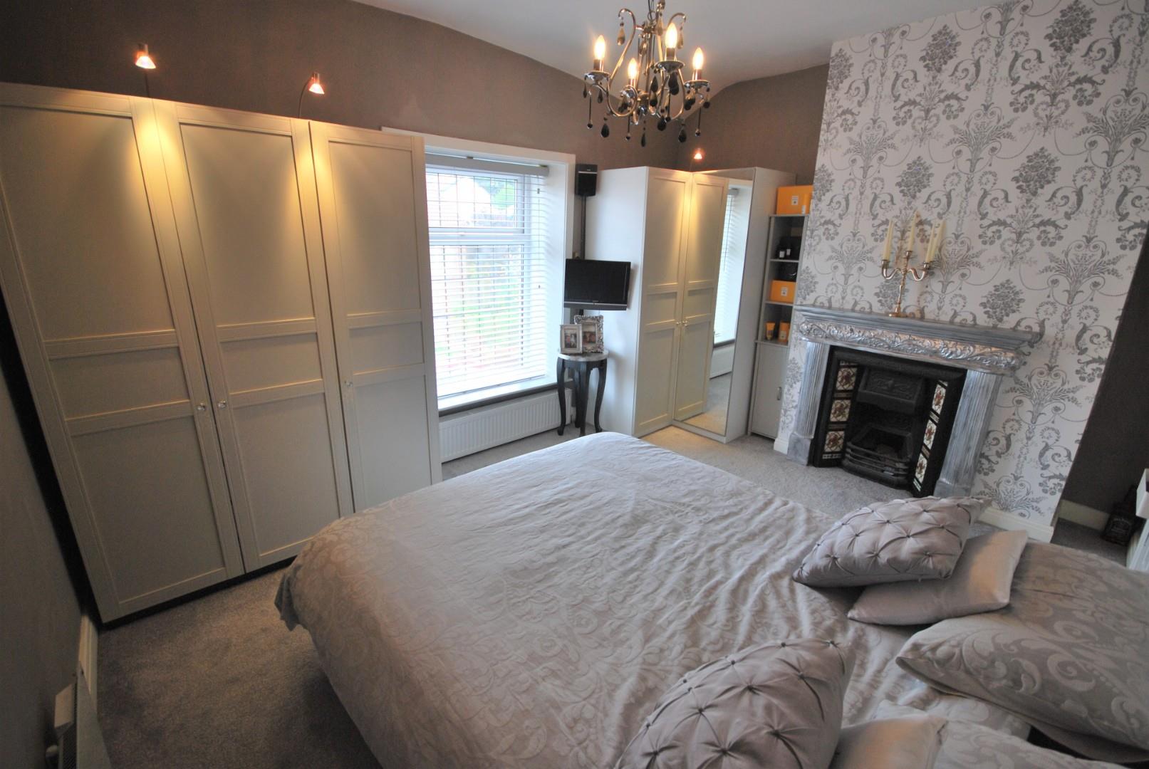 Cast iron fireplace, window to the front.
