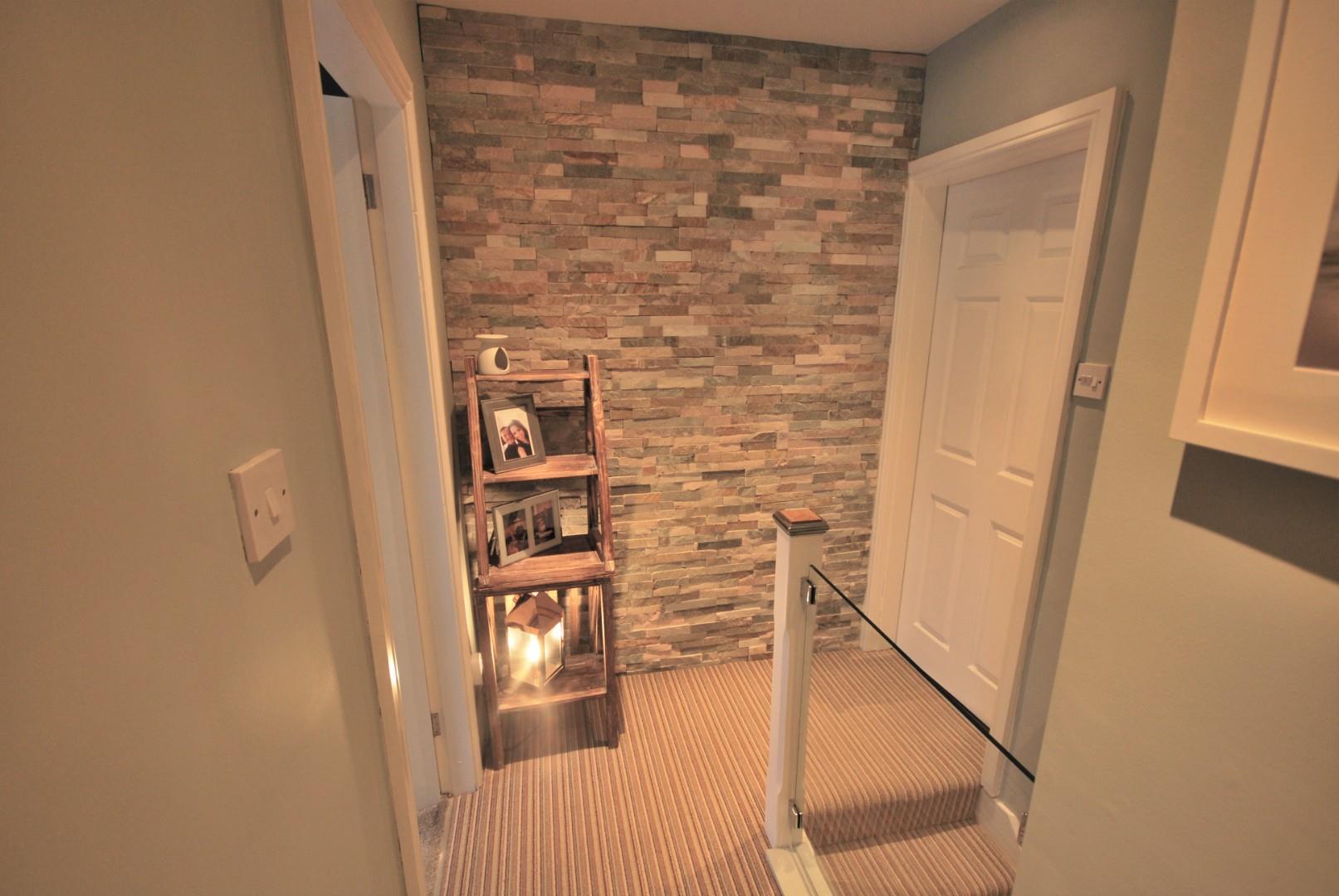 Landing area with part slate tiled elevation and glass balustrade, access to loft ladders.