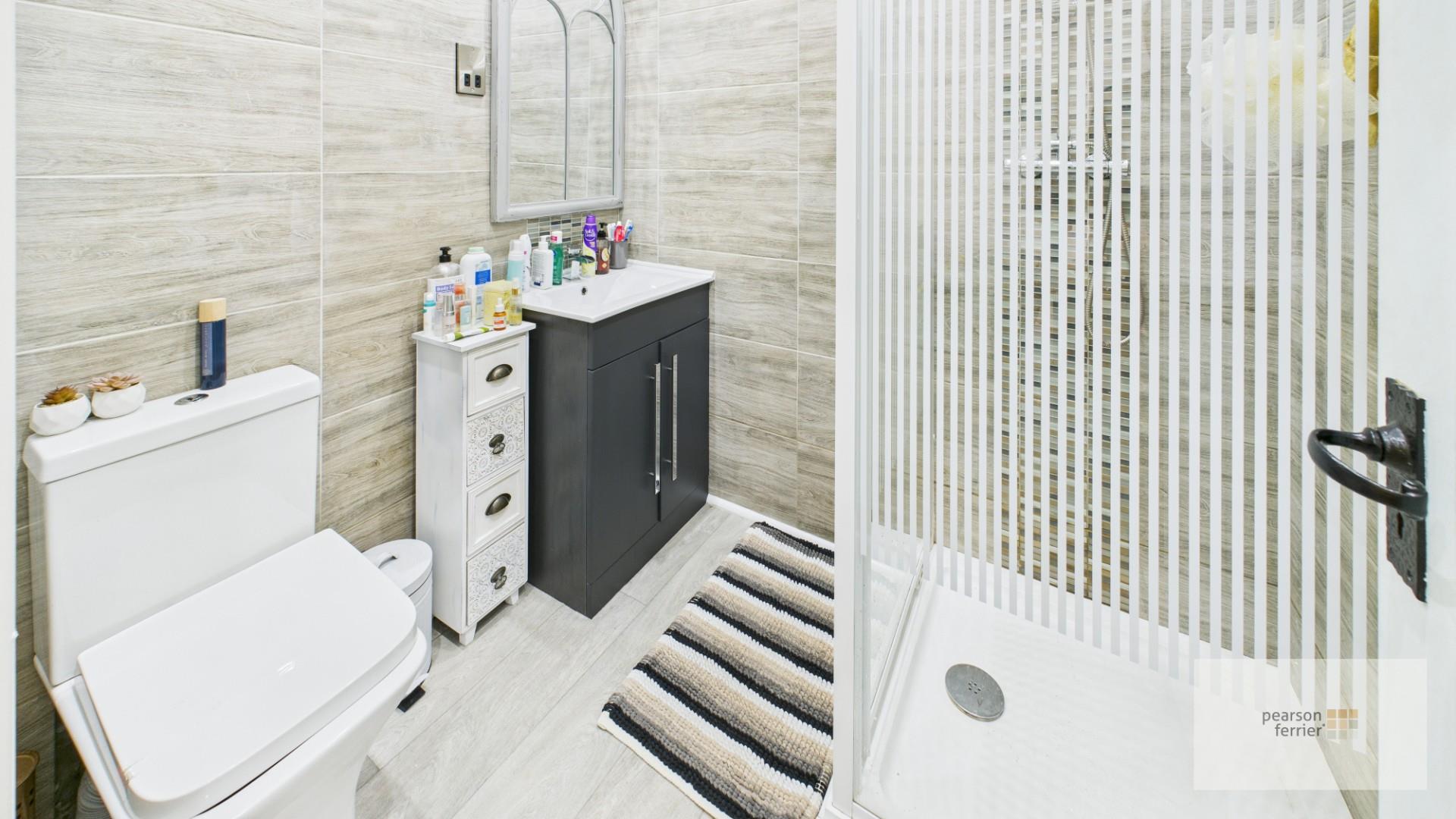 Three piece suite in white comprising: a low flush w.c., wash hand basin and shower cubicle with thermostatic shower. Tile walls, LED lighting.