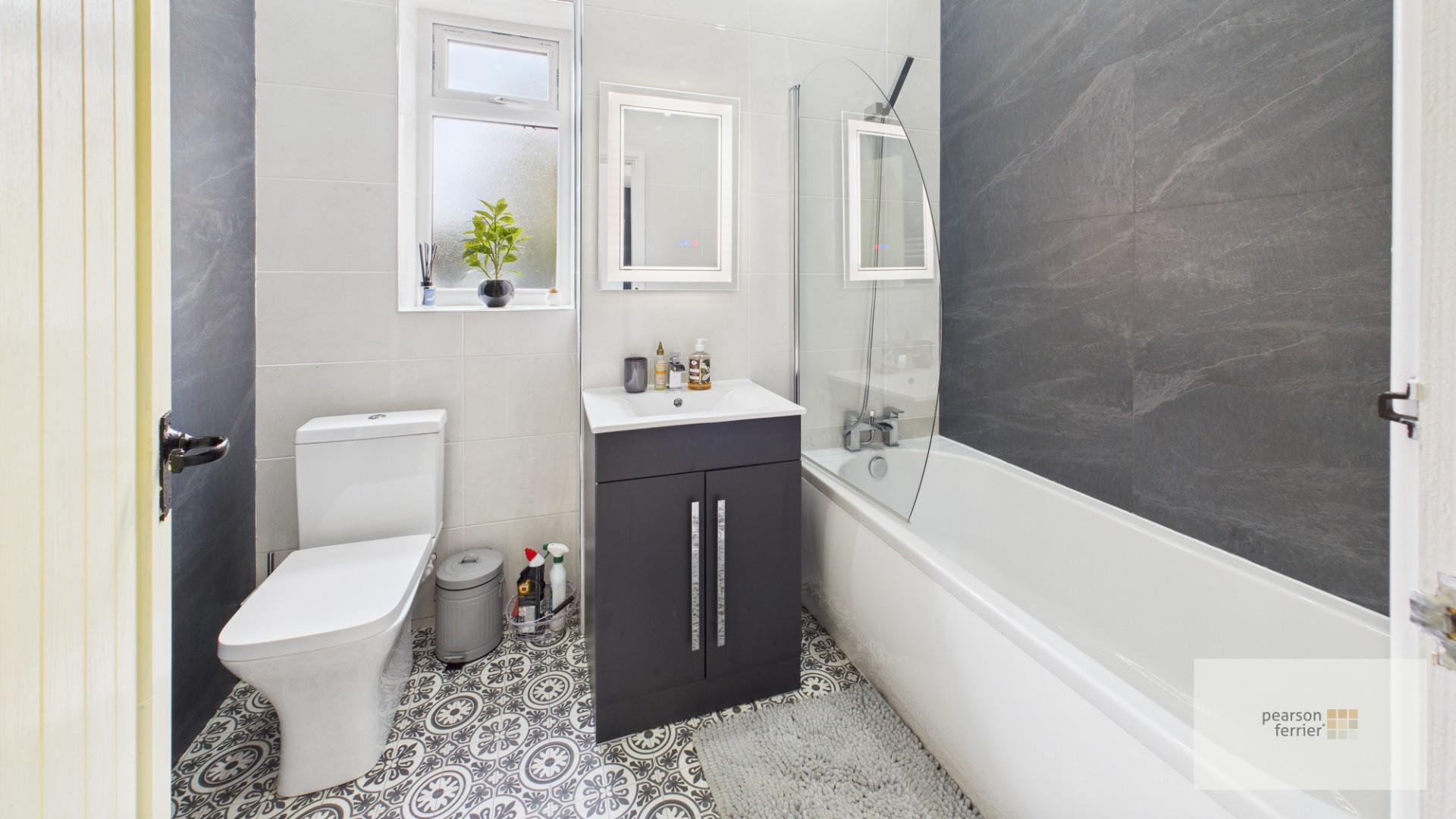 Three piece suite in white with low flush w.c., wash hand basin and panelled bath with shower attachment over. Contemporary tiling, LED lighting and upvc double glazed window to the side.